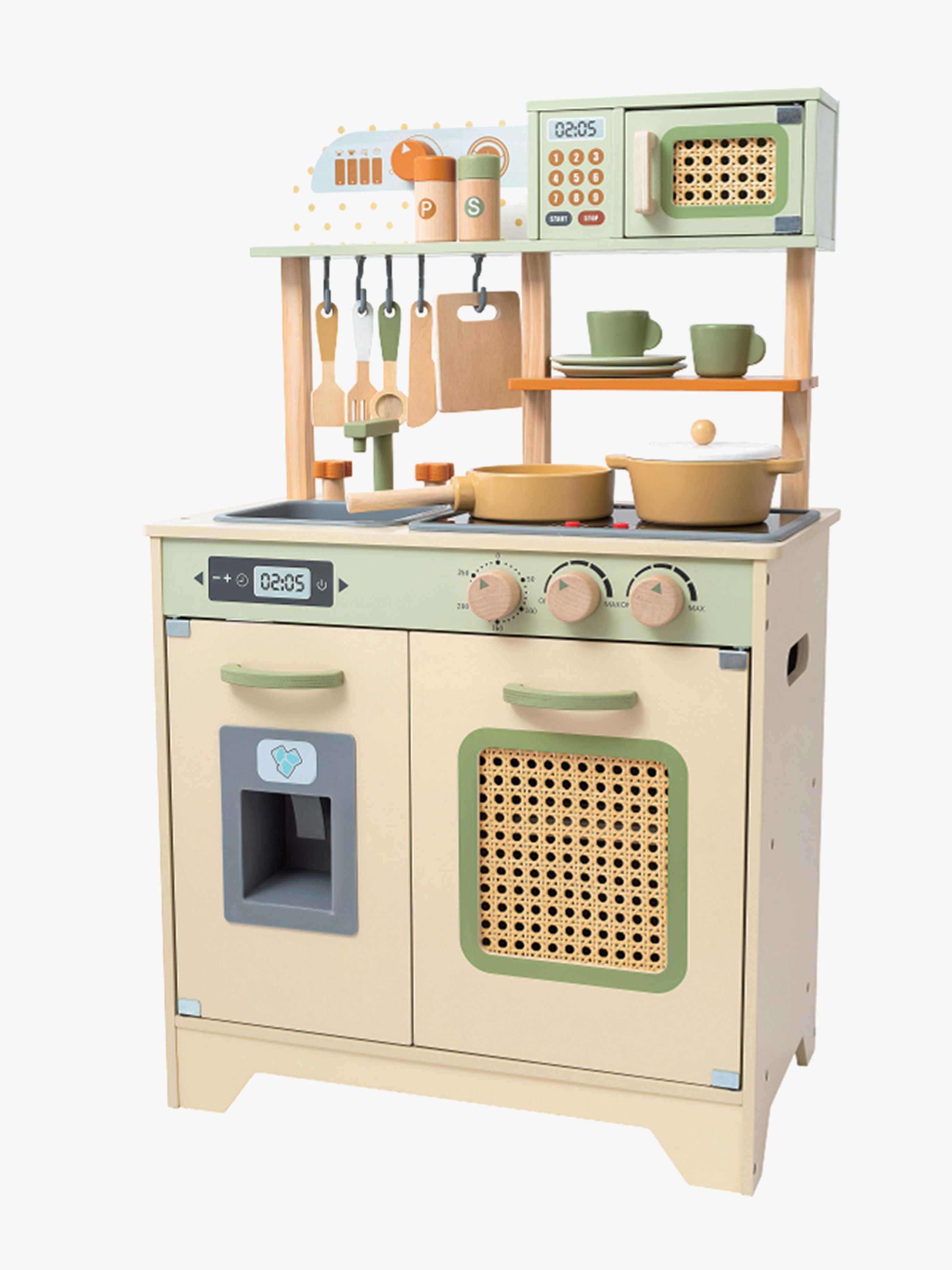 Fint køkkensæt fra Alice & Fox med et klassisk design. Det har realistiske funktioner at udforske. Perfekt til timevis af fantasifuld leg. - Indeholder: 1 legekøkken, 1 kasserolle, 1 stegepande, 1 salatskål, 1 peberkværn, 5 køkkenredskaber, 2 tallerkener, 2 kopper. - Legekøkkenet har vask, komfur og ovn. - Moderne og tidløst design. - Kroge til at hænge køkkenredskaber på. - Rengøres på overfladen med en fugtig klud. - Dele, der kan åbnes. - CE-mærket. - Anbefalet alder: Fra 3 år. - Træ.