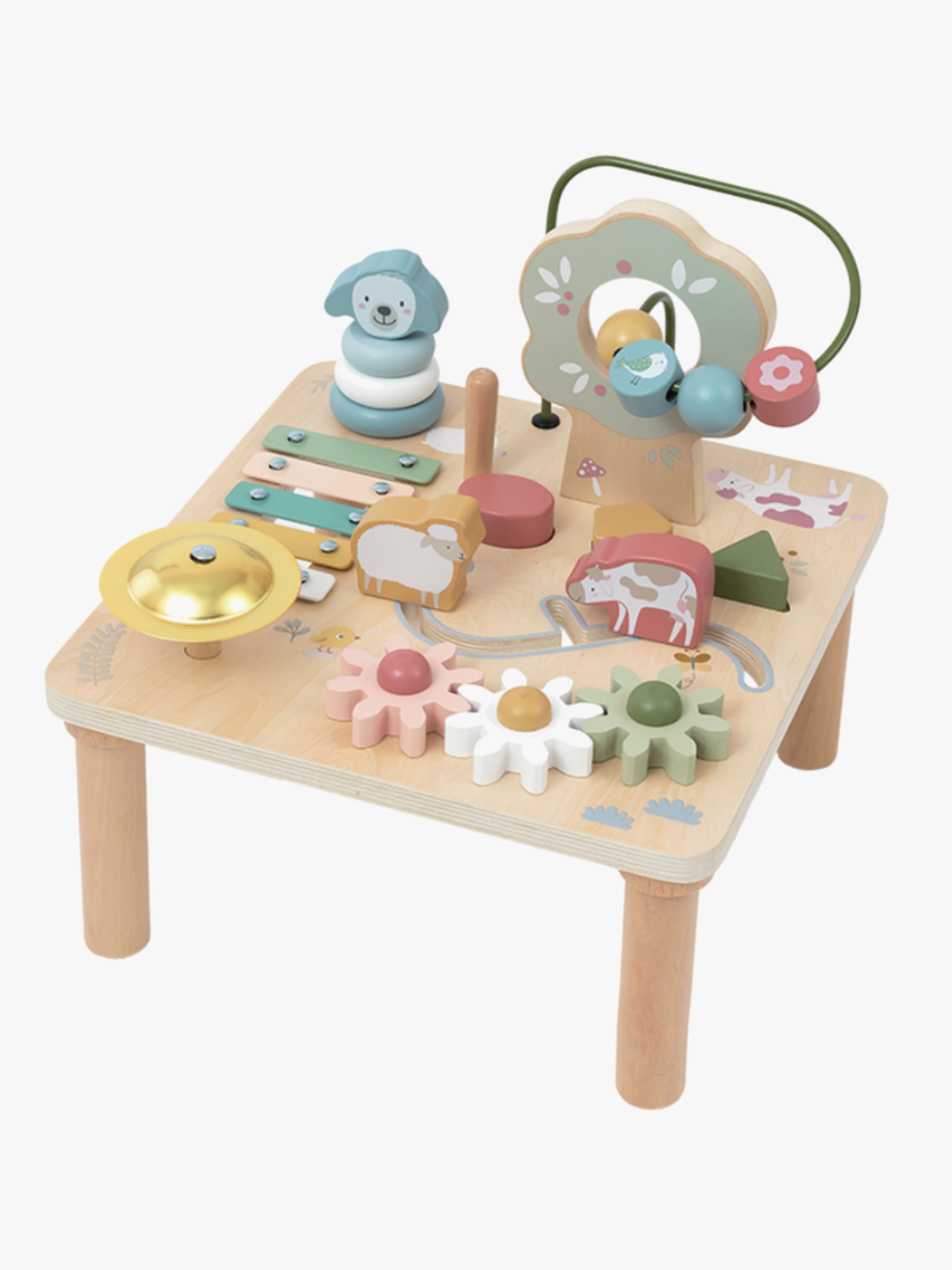Fint aktivitetsbord fra Alice & Fox i flotte farver med et design. Det har mange sjove aktiviteter og funktioner at udforske. Perfekt til træning af dit barns koordination og finmotorik. - Kuglebane. - Labyrint. - Roterende tandhjul. - Xylofon. - Dit barn kan øve sig i at stable og sortere. - Formgenkendelse. - Let at rengøre med en fugtig klud. - Udvikler kognitive og finmotoriske færdigheder. - CE-mærket. - Anbefalet alder: Fra 2 år. - Massivt træ, MDF, krydsfiner.