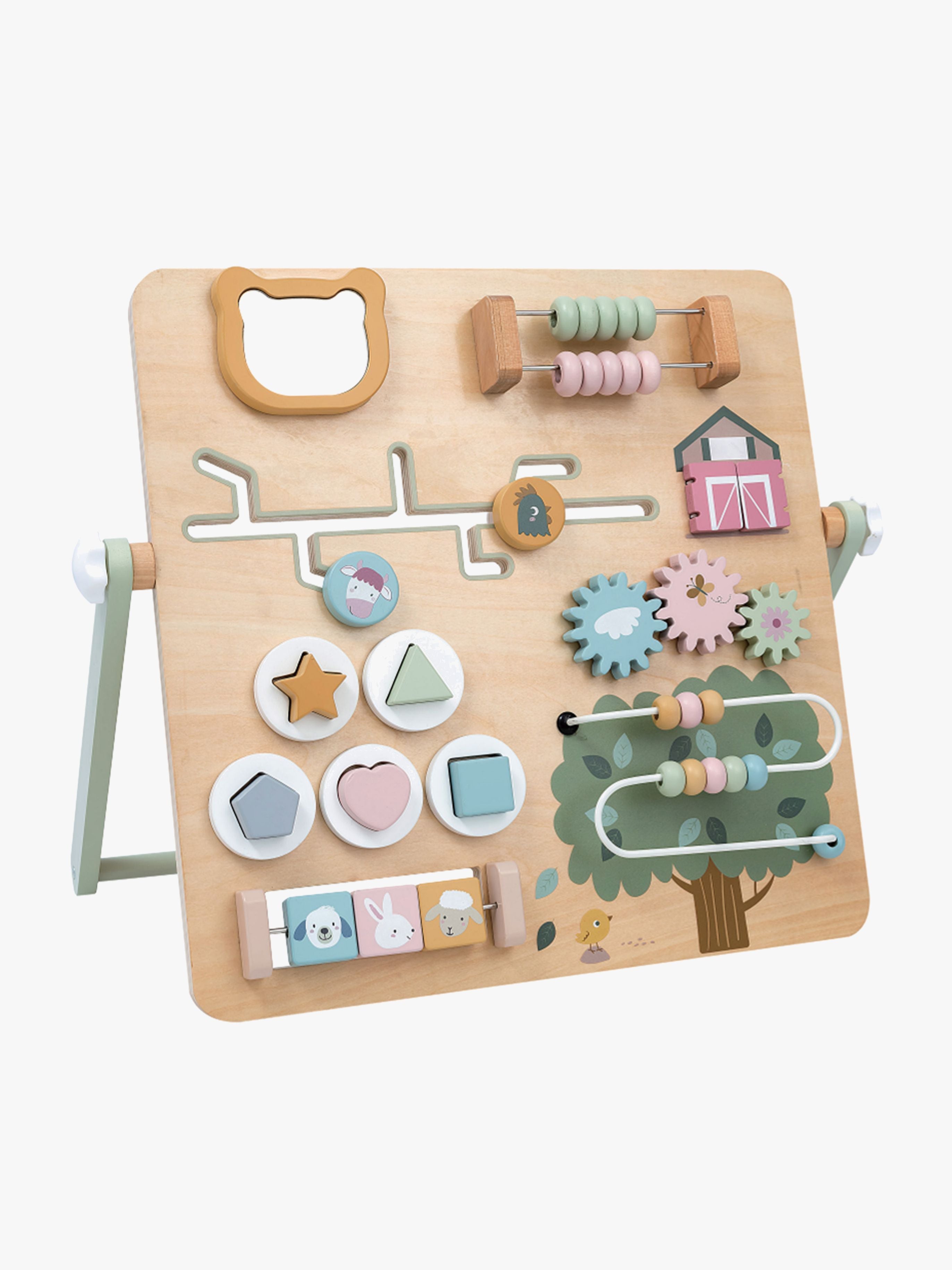 Aktivitetstavle fra Alice & Fox til leg og forbedring af dit barns motorik med et sjovt design. Den har et indbygget stativ og en masse spændende funktioner at udforske. Perfekt til mange timers sjov. - Labyrint. - Kuglebane. - Match former. - Perfekt til både leg og indlæring! - Indbygget stativ. - Sjove farver og et spejl til visuel stimulering. - Perfekt til træning af dit barns hånd-øje-koordination og finmotorik. - Anbefalet alder: Fra 2 år. - Træ.
