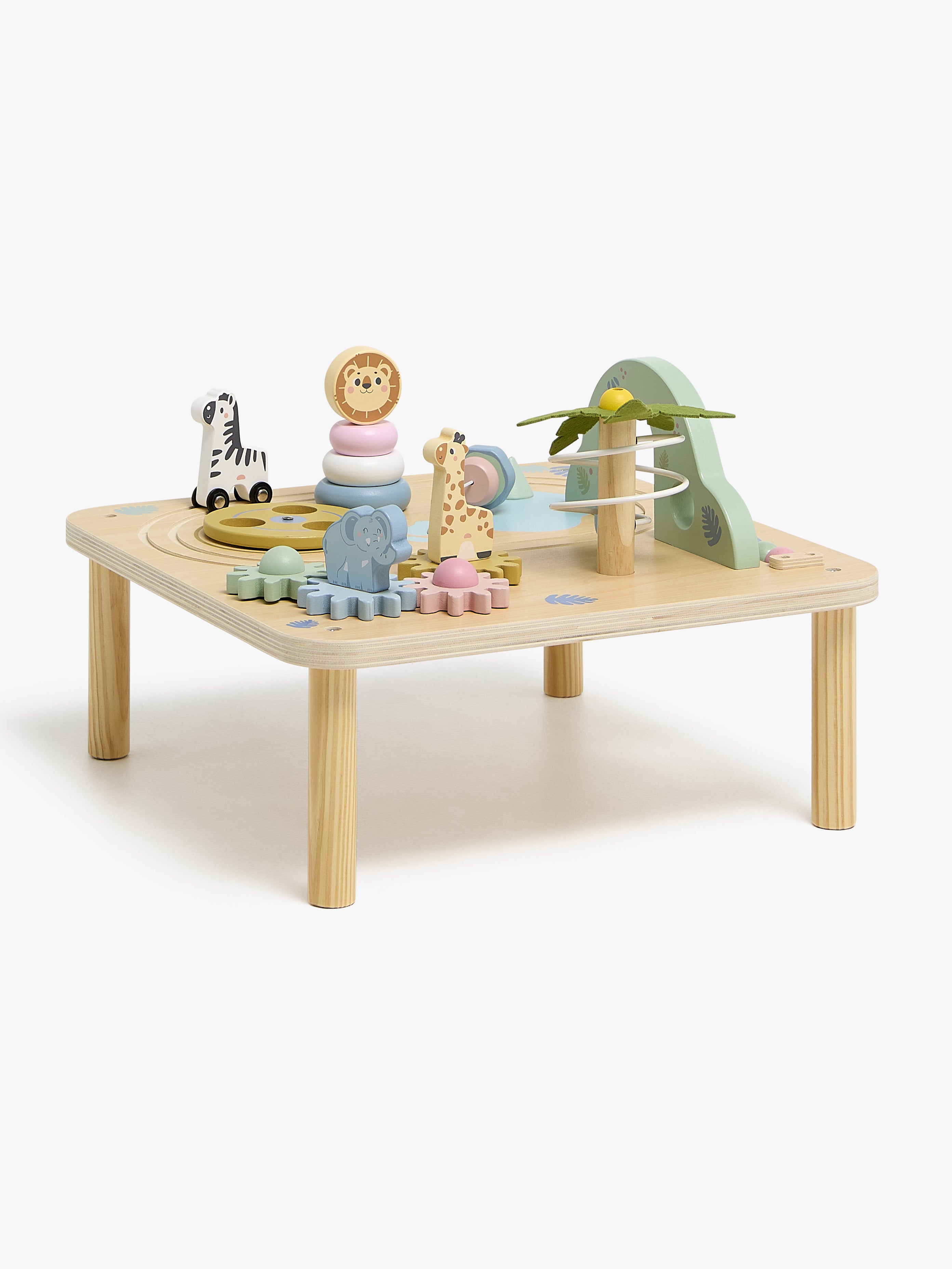 Fint aktivitetsbord fra Alice & Fox i flotte farver med et sjovt safaritema. Det har mange sjove aktiviteter og funktioner at udforske. Perfekt til træning af dit barns koordination og finmotorik. - Kuglebane. - Roterende tandhjul. - Dit barn kan øve sig i at stable og sortere. - Formgenkendelse. - Let at rengøre med en fugtig klud. - Udvikler kognitive og finmotoriske færdigheder. - CE-mærket. - Anbefalet alder: Fra 2 år. - Massivt træ, MDF, krydsfiner.
