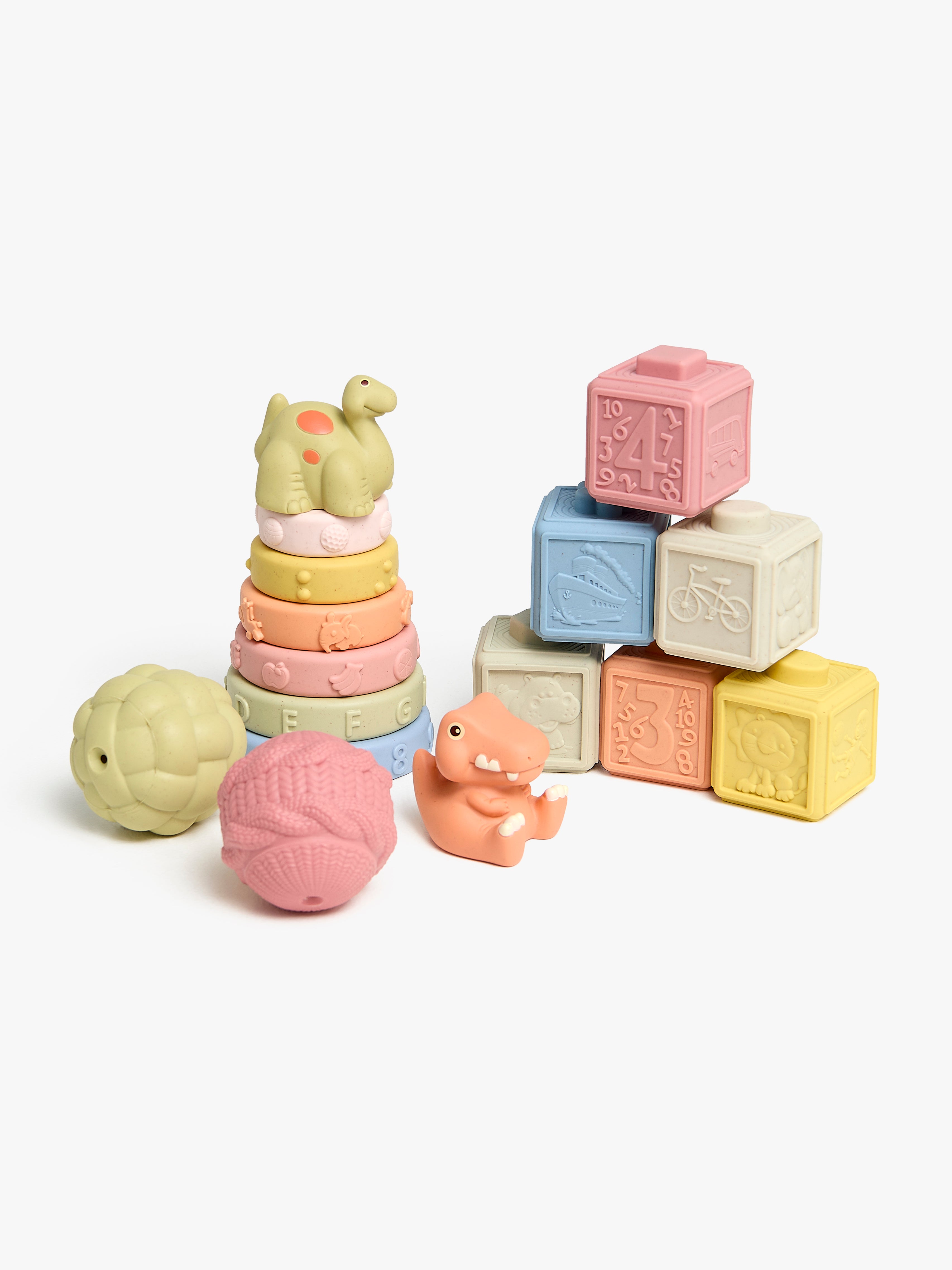 Bløde stableklodser fra Cloudberry Castle med forskellige overflader at udforske. De har klodser og ringe i flotte farver med søde dinosaurer. Perfekte til mange timers sjov. - 16 stk. - Kan stables og balanceres. - Bløde og afrundede kanter. - Gribevenligt særligt lavet til små hænder. - Fine farver. - Opmuntrer til træning af fin- og grovmotorik, hånd-øje-koordination og sensorisk udvikling. - Fremstillet af miljøvenligt materiale. - CE-mærket. - Anbefalet alder: Fra 1,5 år. - 30 % hvedestrå, 70 % PVC-plastik.