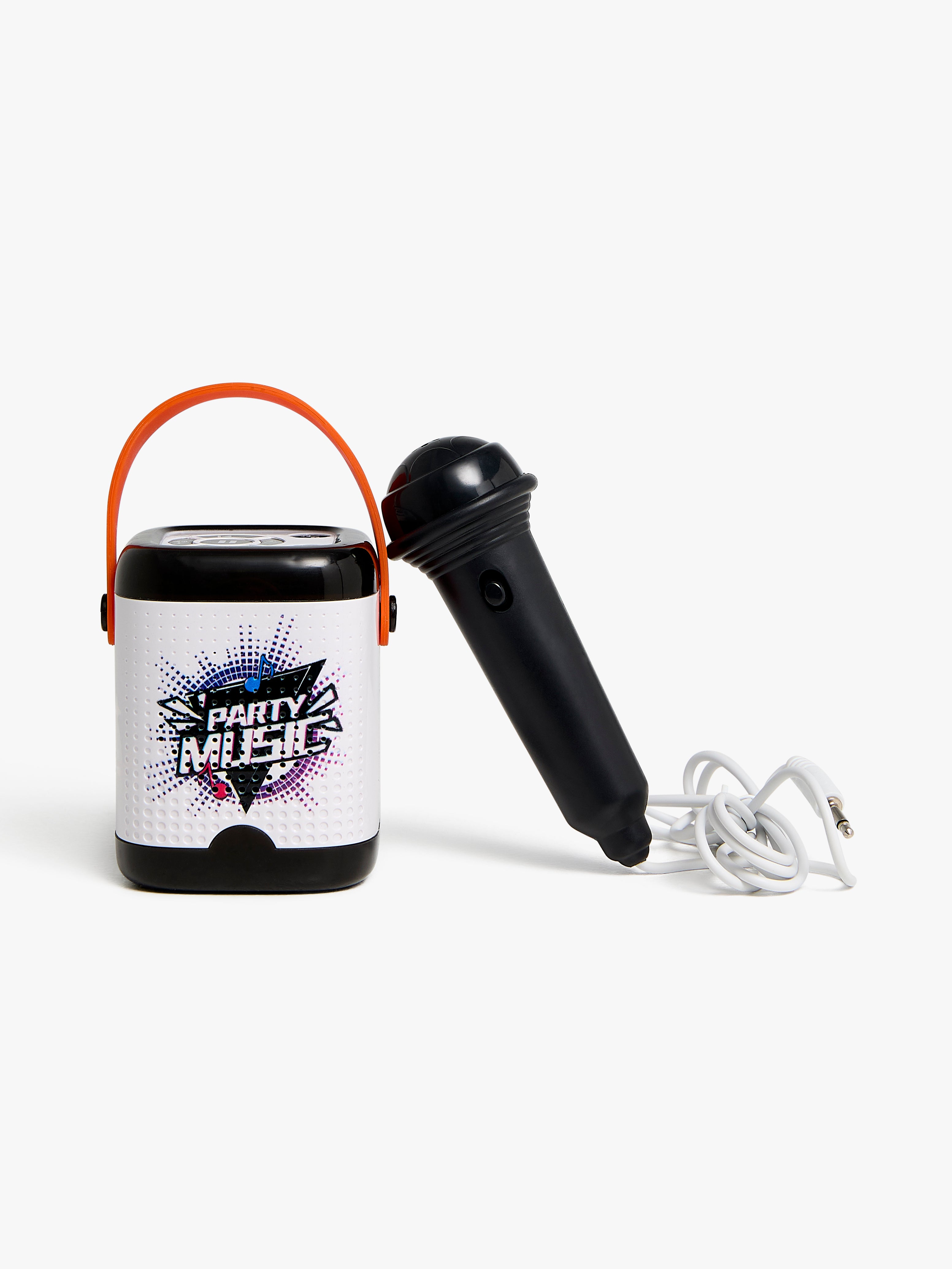 Karaokemaskine fra Cloudberry Castle med en medfølgende mikrofon. Den har en sej ekko-effekt og blinkende lamper i forskellige farver. Perfekt til den lille musiker. - Indeholder: 1 karaokemaskine, 1 mikrofon, 1 USB-opladerkabel. - Kan tilsluttes trådløst til iPhone/smartphone/tablet. - Volumenkontrol. - Blinkende lys i forskellige farver. - Bluetooth. - Indbygget musik. - Ekko-lydeffekt. - Praktisk bærehåndtag. - CE-mærket. - Anbefalet alder: Fra 3 år. - Plastik, elektronikkomponent. - Batterier medfølger.