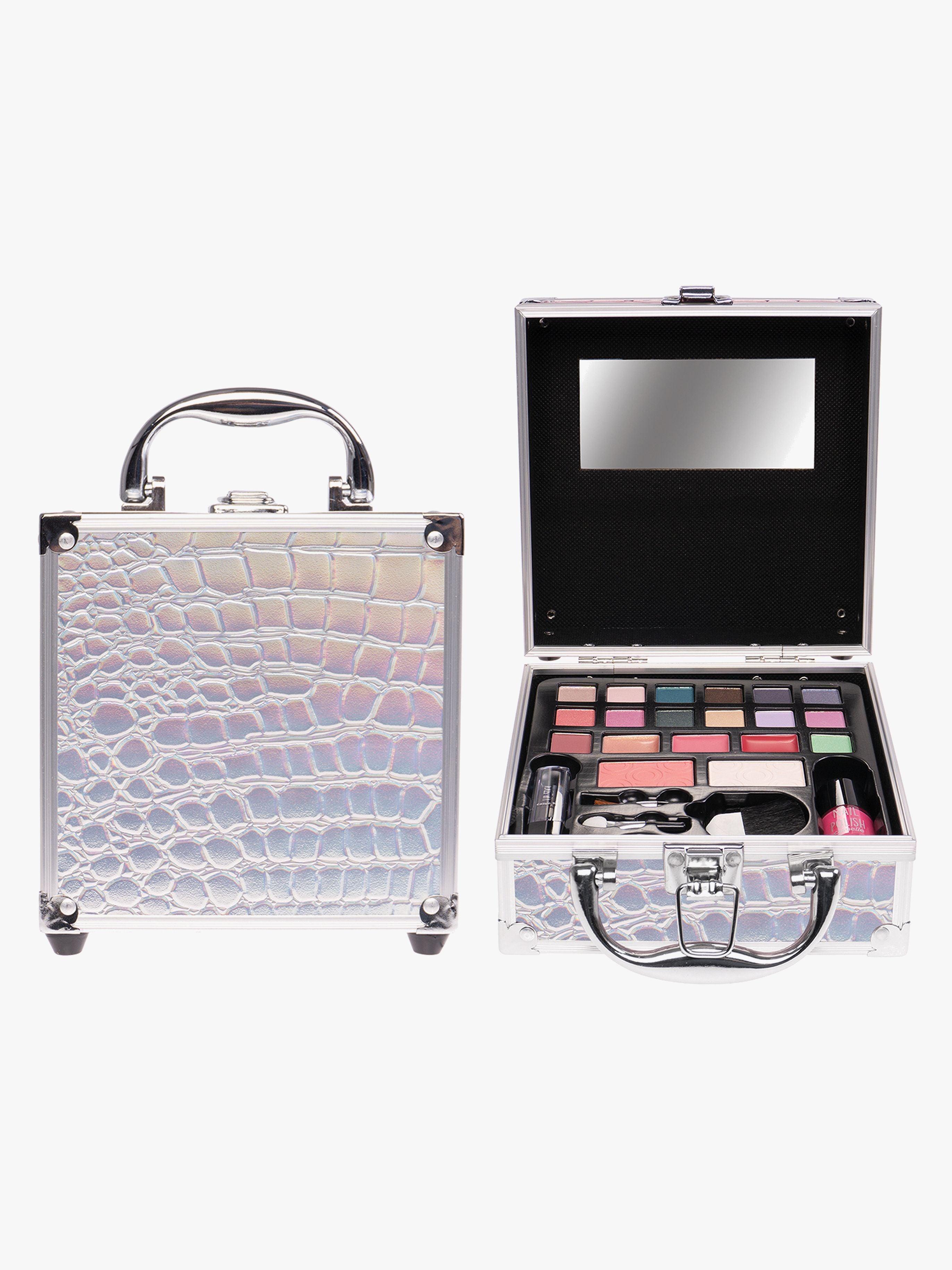 Sølvfarvet makeuptaske fra Casuelle med farverig makeup til øjne, læber, ansigt og negle. Perfekt til at udtrykke din kreativitet med. - Indeholder makeup til øjne, læber, kinder og negle. - Praktisk bærehåndtag. - Spejl. - Stimulerer dit barns kreativitet. - CE-mærket. - Anbefalet alder: Fra 5 år. - Aluminium, plastik.