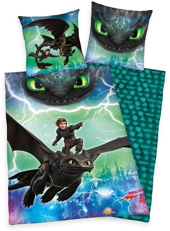 Rigtig fedt How To Train Your Dragon sengetųj med både Toothless og Hiccup på! OBS: Motivet kan ses på fųrste billede (grųnligt motiv), hvor nummer 2 billede fremviser den selvlysende effekt (sengetųjer er altså IKKE sort) Pudebetrękket måler: 70x9