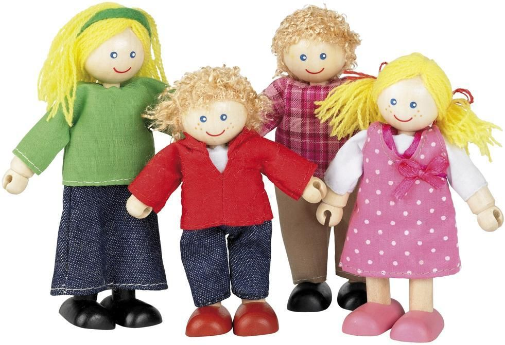 Sød dukkefamile med en mor, far, søster og bror. Alle har bevægelige arme og ben Højden på faren er 11,50cm
