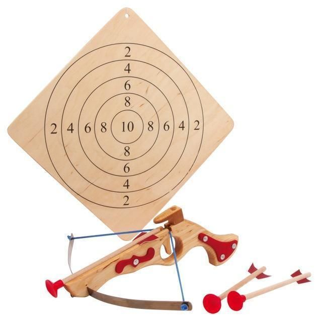 Skyd mod skydeskiven med denne flotte armbrøst lavet af træ og metal. Armbrøsten skyder med pile med sugekopper. Træn Hånd til øje koordinationen. Armbrøst: Ca. L33 x B2 x H12 cm Målskive. Ca. L30 x H30 x B0,5 cm