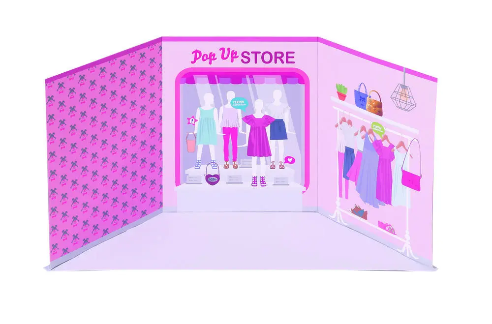 I gĺr var det en bunke pap, i dag er det en lille butik. Det er simpelt saml baggrundene og sĺ er butikken klar. Hylderne har plads til to par sko, et par lyserřde solbriller, et par blĺ hjerteformede briller og to armbĺnd. Pĺ to břjler hćnger der en kjo