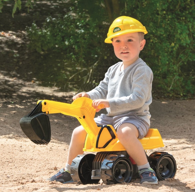 LENA® GIGA TRUCKS Ride-on Excavator Pro X. Robust gravemaskine med stort sæde 6 mm galvaniserede stålaksler. Moderne og detaljeret design. Skovl virker op til 20 cm i dybde, drejer 360°, kan låses. Skovl med 2 praktiske håndtag Nem at bruge for børn 68 cm