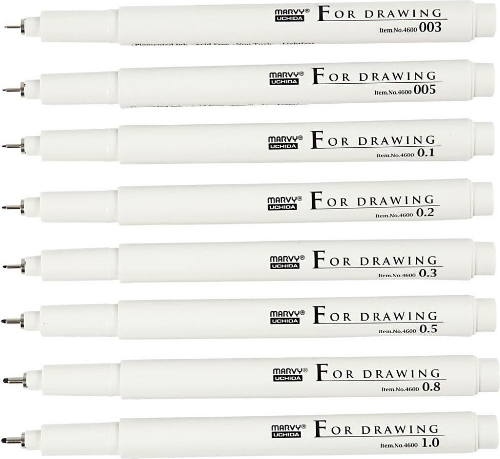 Fine Line Skrive/tegnetusch - Tykkelse 0,03+0,05+0,1+0,2+0,3+0,5+0,8+1,0 Mm - Sort - 8 Stk.
