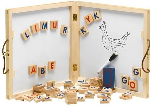 Sjov whiteboardtavle. På den ene side whiteboard, og på den anden side alm. kridttavle. Fantastisk legetøj, hvor barnet kan lære at tegne, skrive og regne på en sjov måde. Indeholder tavle, whiteboard, viskeklud, tus og 67 bogstaver med magneter. Indeh