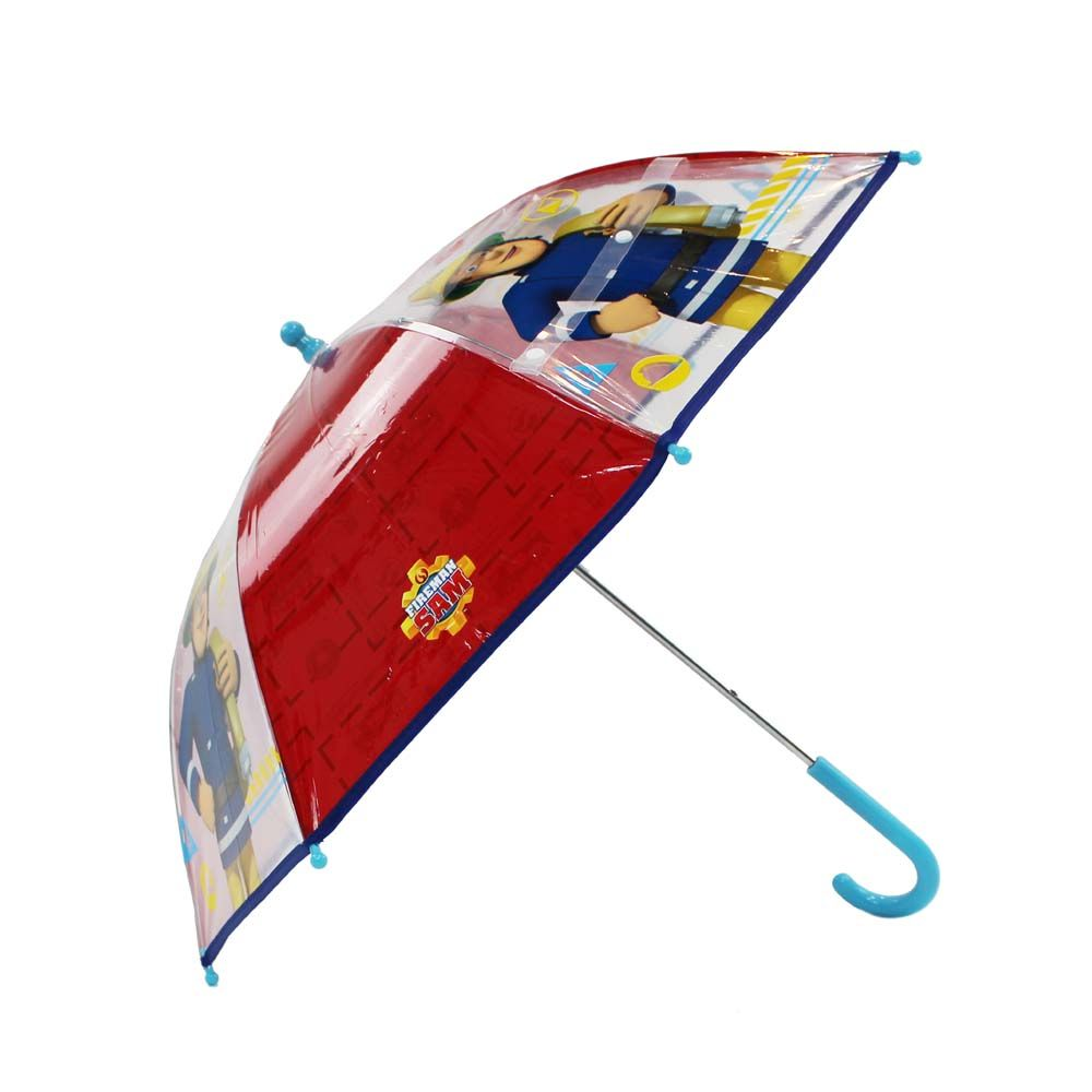 Sej paraply med motiv af Brandmand Sam. Paraplyen har skiftevis røde og gennemsigtige felter med et blåt håndtag.
