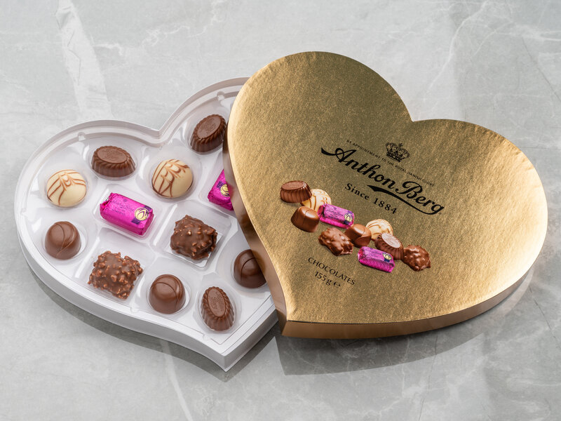 Et hjerte til den der bor i dit hjerte? Her har vi en hjerteformet chokoladeæske fyldt med lækkert marcipanbrød og fyldte chokolader fra Anthon Berg!