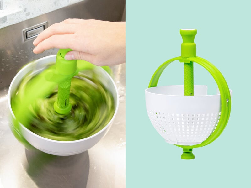 Ved første øjekast kan dette ligne et almindeligt dørslag. Når først du prøver, vil du dog indse, at det er meget mere end det. Dette er et 2-i-1 produkt, der kan bruges som både dørslag og salatslynge.