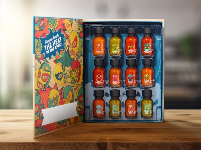 Giv smagsløgene en heftig overraskelse! Viva La Picante! fra Thoughtfully er en farverig gaveæske med 12 små flasker med stærke saucer i forskellige smagsvarianter. Perfekt til dem, der elsker varme og ønsker at opdage nye favoritter.