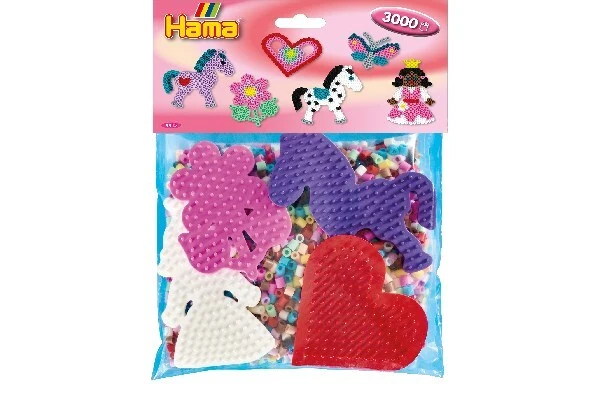Pose med 3000 stk. perler og 4 stk. stiftplader lille hjerte, lille blomst, pony, lille prinsesse, motivark, vejledning og strygepapir.