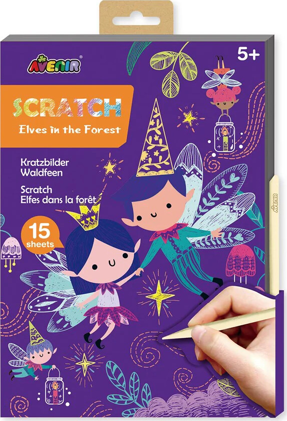 Denne unikke scratchbog inviterer dig til at afsløre et fortryllende skovlandskab fyldt med elvere...