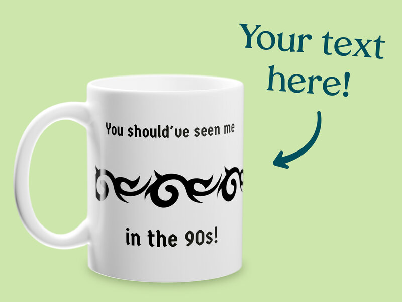 Tag på en tidsrejse tilbage til 90'erne med dette nostalgiske, personlige krus! Perfekt for dig, der ønsker et skvæt retrostil til kaffepausen eller som den ultimative gave til en, der oplevede årtiet med fede tribal-tatoveringer, Tamagotchis og Spice Girls.