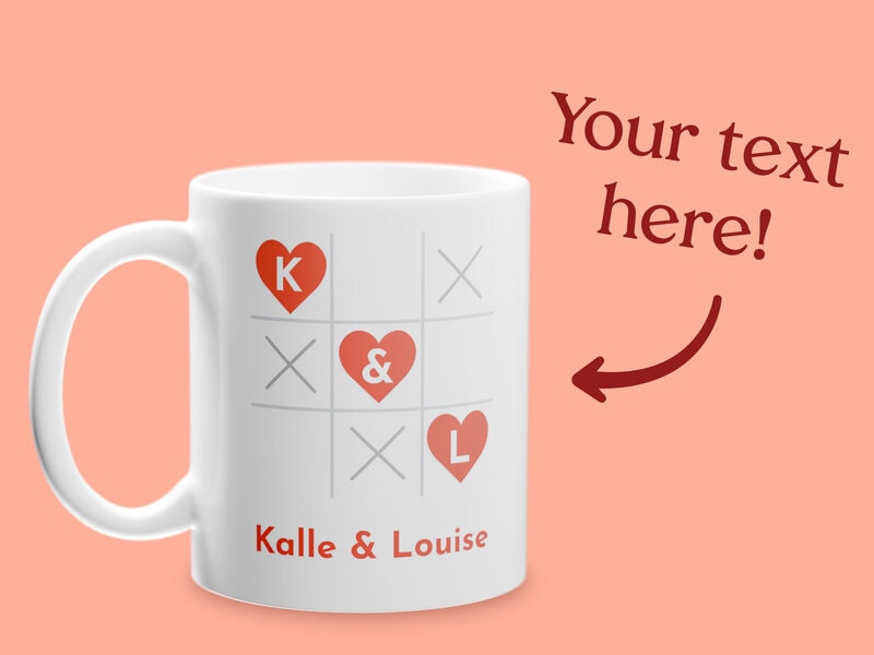 En kop kaffe og et spil om kærligheden? Ja tak! Design dit eget krus hvor de tre hjerter danner en vindende række - fyldt med dine valgte bogstaver.
