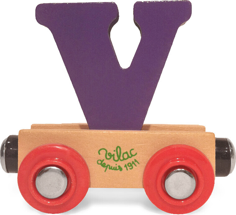 Togvogn med bogstavet V og magnetkobling i begge ender, så den kan trękkes af Vilacs lokomotiv og...