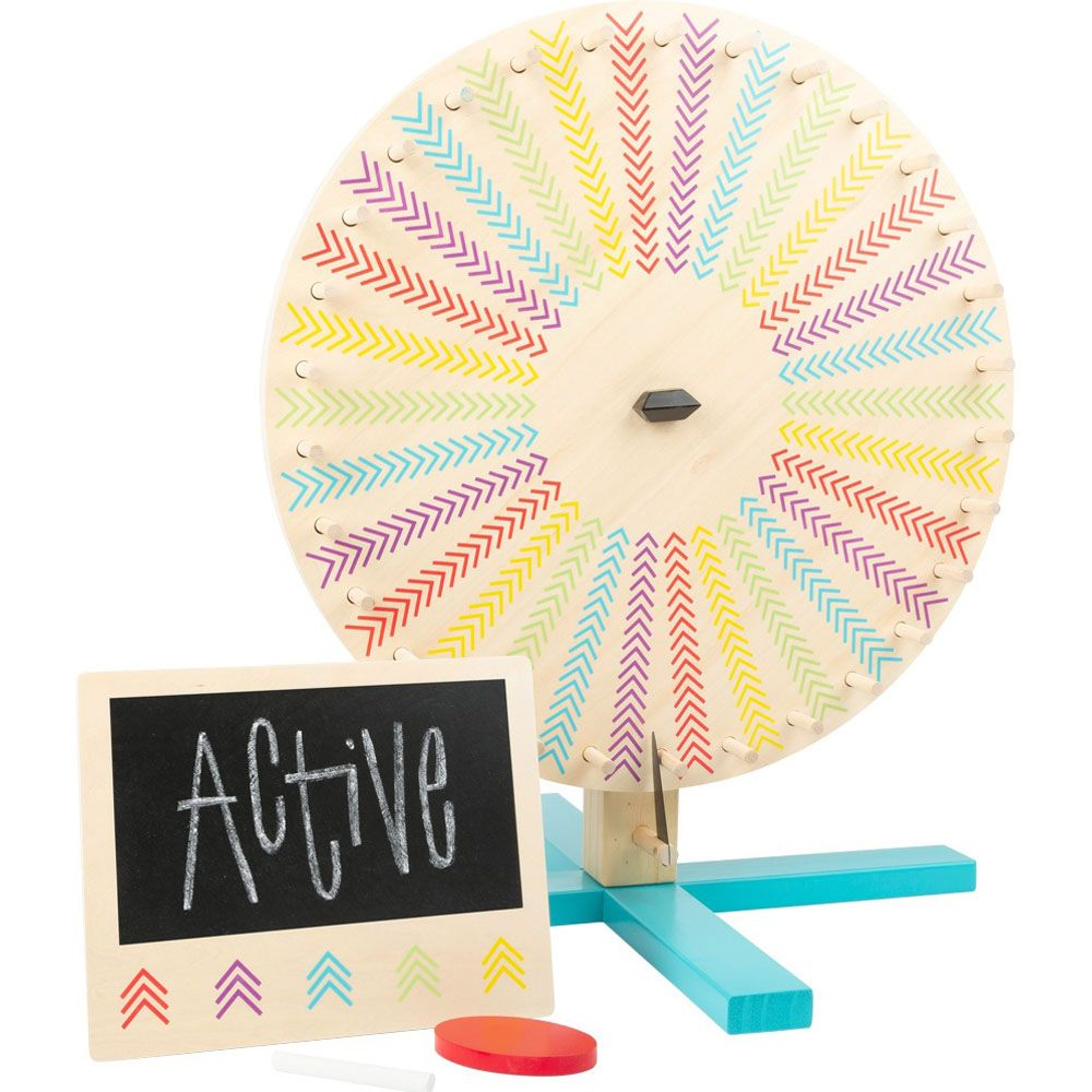 En vinder for hvert spin! Dette lykkehjul af træ består af en skive, der drejer, og som nemt kan ændres. Der er 30 farvefelter på den ene side, og en tavle på den anden side. Med dette kan du lave dine egne felter, der kan landes på igen og igen. Holdene