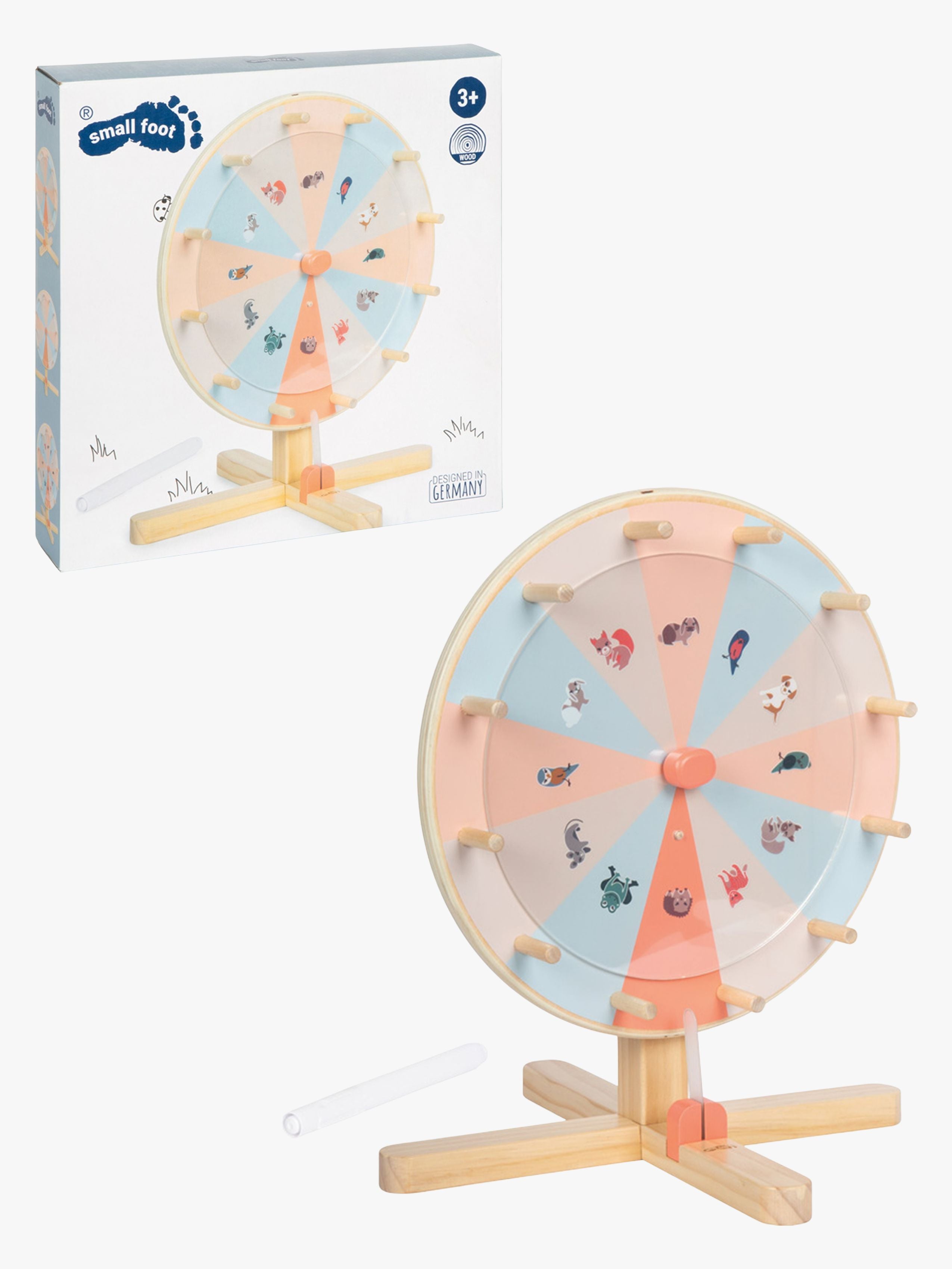 Fint Prishjul fra Small Foot med et sjovt design. Det har to udskiftelige skiver med dyremotiver og tal og en medfølgende tus til at skrive på glasskiverne. Perfekt til masser af leg. - Alsidig brug. - Søde dyremotiver. - To udskiftelige skiver med dyremotiver og tallene 1-12. - Skrive- og aftørringsbar plexiglasplade. - Perfekt til fester og sjove lege. - Udvikler finmotorik, øje-hånd-koordination og koncentration. - CE-mærket. - Anbefalet alder: Fra 3 år. - Træ.