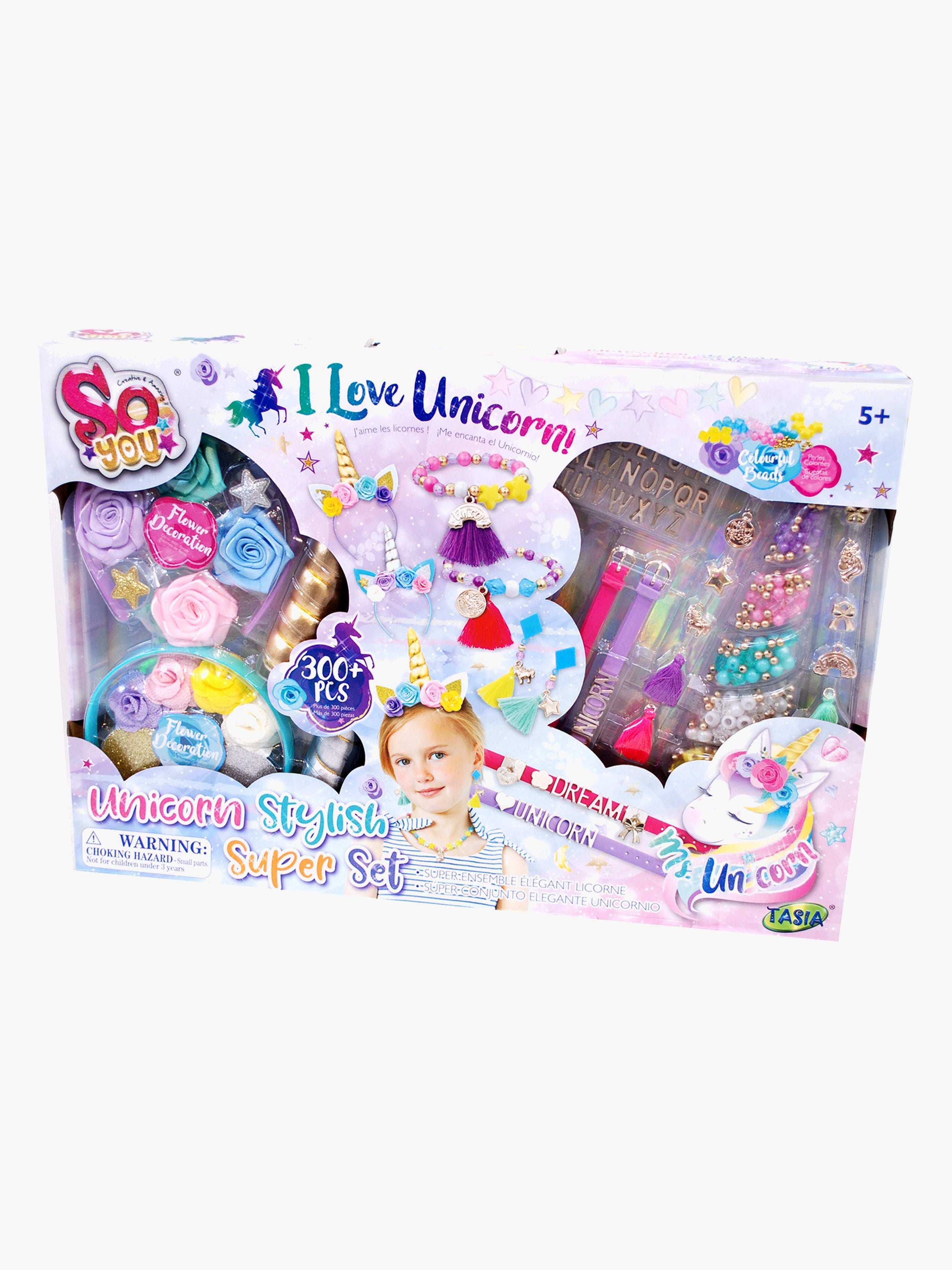 Lav dine egne smykker og diadem med dette farverige enhjørningsperlesæt fra So Breads. Det sjove kreasæt indeholder massevis af fine perler, farverige kæder og vedhæng. Sættet indeholder desuden flere fine dekorationer, som kan bruges til at pynte enhjørningsdiademet med. Lav et armbånd til dig selv, eller måske to venskabsarmbånd til dig og din bedste ven! Der medfølger flere bogstavsperler, som du let kan kombinere til navne og ord efter eget valg. Lad kreativiteten få frit løb! Anbefalet alder: Fra 5 år.