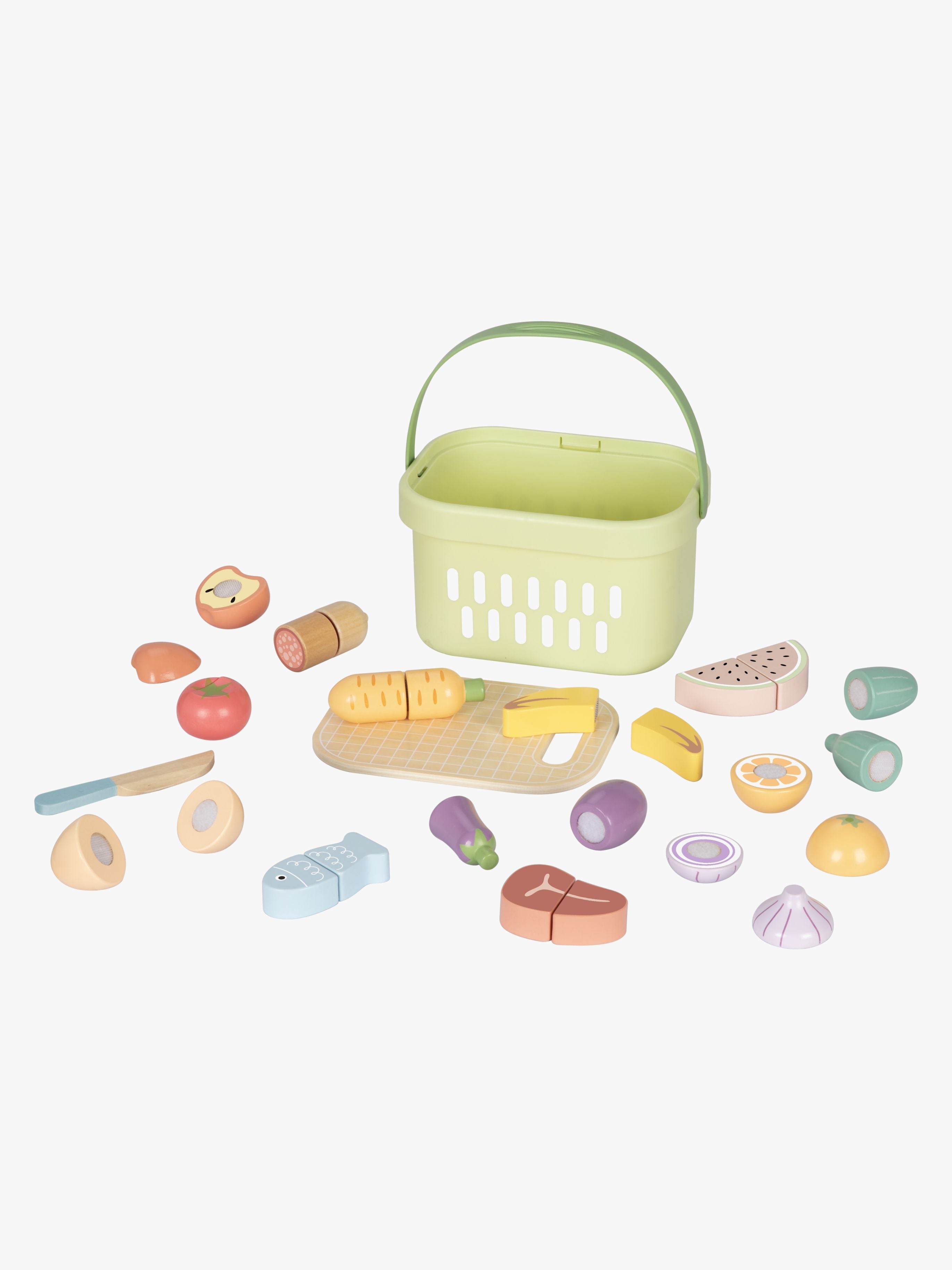Spisesæt fra Tooky Toy med en masse sjovt tilbehør og et sjovt design. Perfekt til timevis af fantasifuld leg. - Indeholder: 1 kurv, 1 skærebræt, 1 legetøjskniv, 13 fødevarer. - Holdes sammen med velcro, så de adskilles realistisk, når de skæres i skiver. - Masser af søde detaljer. - Kun fantasien sætter grænserne. - Mål: H 34 x B 23 x L 54 cm. - CE-mærket. - Anbefalet alder: Fra 3 år. - Enebærtræ, MDF, plastik.