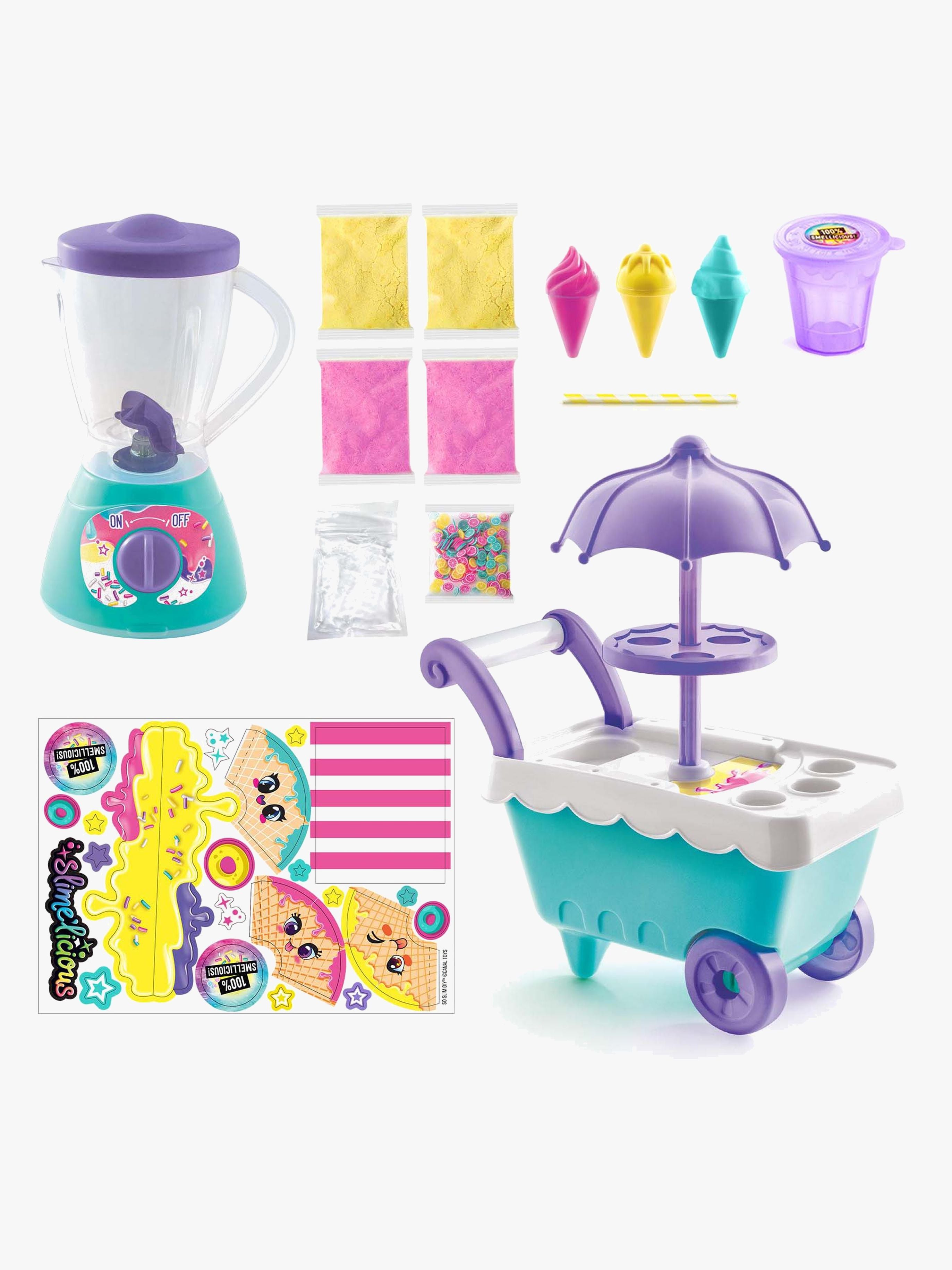 Sæt fra So Slime med en masse spændende tilbehør, så du kan skabe dit eget slime. Perfekt til timevis af kreativ leg. - Indeholder: 1 blender, 1 vogn, 1 shaker, 3 iskugler, 4 slimepulver, 1 dekorationssæt, 1 sugerør, 1 klistermærkeark. - Blot tilføj vand. - Dufter af frugt. - En sanselig og kreativ oplevelse for både store og små! - CE-mærket. - Anbefalet alder: Fra 6 år. - Plastik.