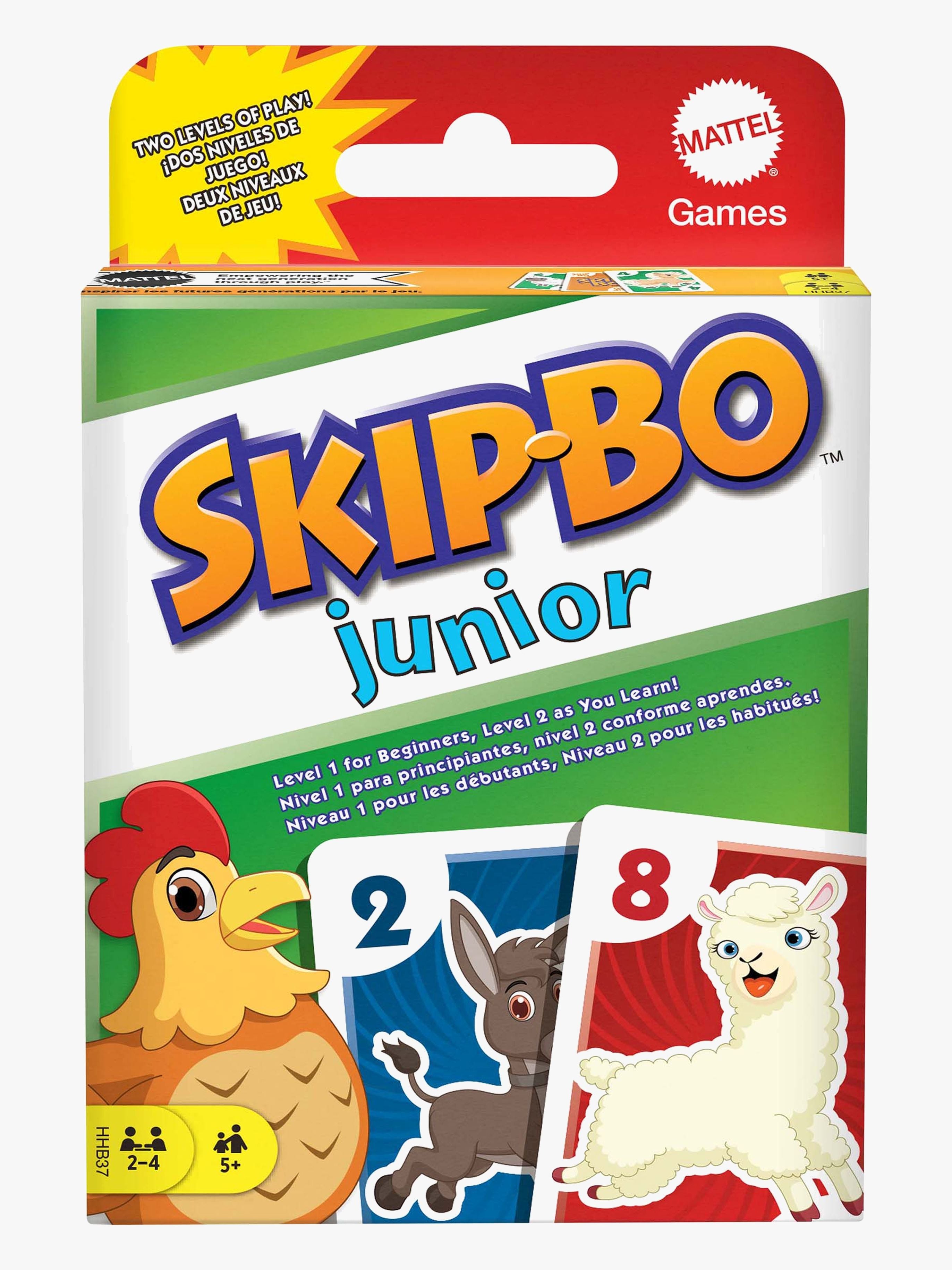 Populęrt Skip-Bo Junior brętspil fra Mattel med kort med dyremotiver. Anbefalet alder: Fra 5 år