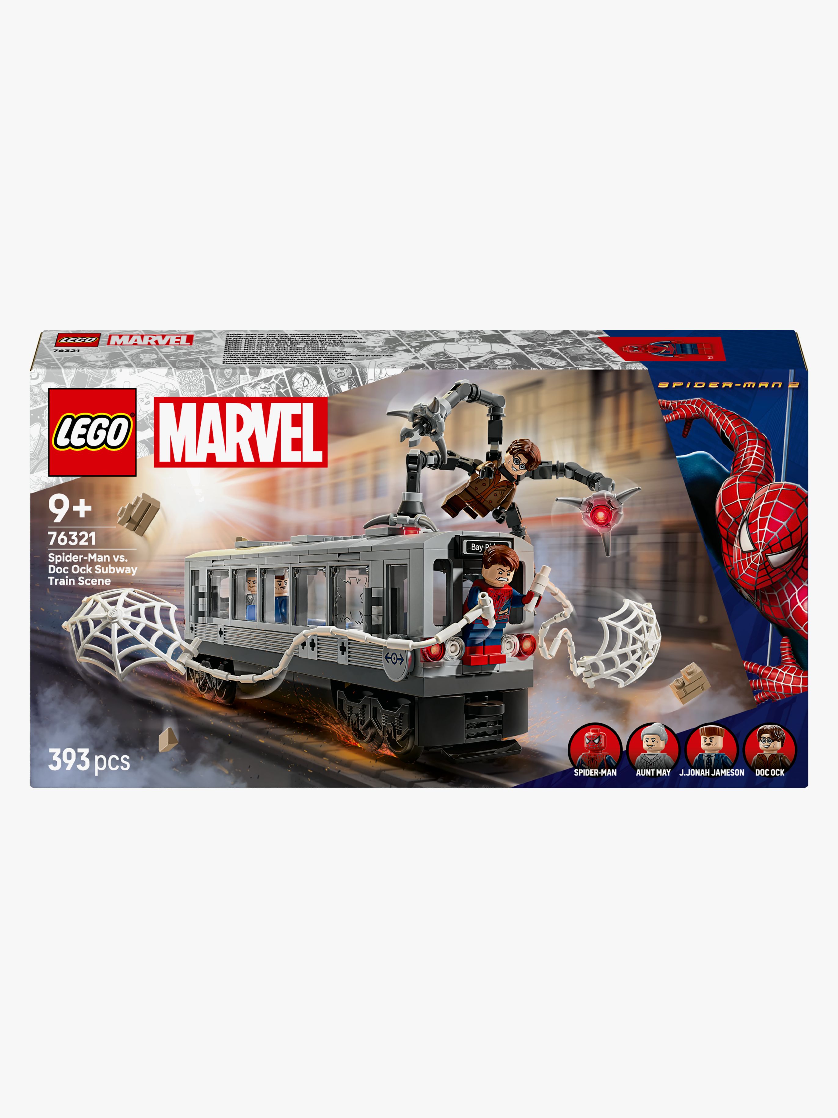 Spider-Man mod Doc Ock – metrotog-scene 76321 er et togbyggesæt til børn, der elsker actioneventyr og kampbaseret LEGO ǀ Marvel byggelegetøj. Med uendelige fantasifulde lege- og udstillingsmuligheder er dette legetøjssæt med superheltetema en fantastisk gave til drenge og piger fra 9 år. Superhelte-legesættet med et tog er baseret på en ikonisk scene fra Marvel Studios-filmen Spider-Man 2. Det indeholder 4 minifigurer: J. Jonah Jameson, tante May, Spider-Man og Doc Ock. Minifiguren af Spider-Man har udskiftelige hoveder – maskeret og umaskeret – og et stort spind, der kan fastgøres til toget. Minifiguren af Doc Ock har 4 leddelte tentakler – 2 med "laserstråle"-elementer og 2, der kan fastgøres til toget. Taget kan løftes af og giver adgang til togets indre, hvor der er siddepladser til minifigur-passagerer. For at få ekstra digitalt sjov kan byggere zoome ind på og dreje modeller i 3D samt holde styr på deres fremskridt med den intuitive LEGO Builder app. Indeholder 393 elementer. — Superhelte-action fra filmen Spider-Man 2 med et byggelegetøj af et tog — Indeholder 4 minifigurer: Spider-Man, Doc Ock, J. Jonah Jameson og tante May — Spider-Man har et stort spindelvæv, og Doc Ock har 4 leddelte tentakler — Minifiguren af Spider-Man to hoveder at skifte imellem – maskeret og umaskeret — Byggemodel af metrotog til børn som gave til drenge og piger fra 9 år — Børn kan zoome ind på og dreje byggesæt i 3D ved hjælp af den intuitive LEGO Builder app — LEGO ǀ Marvel byg-selv-sæt giver børn endeløse superhelte-eventyr mellem hænderne — Lege- og udstillingssættet med 393 elementer er over 23 cm langt