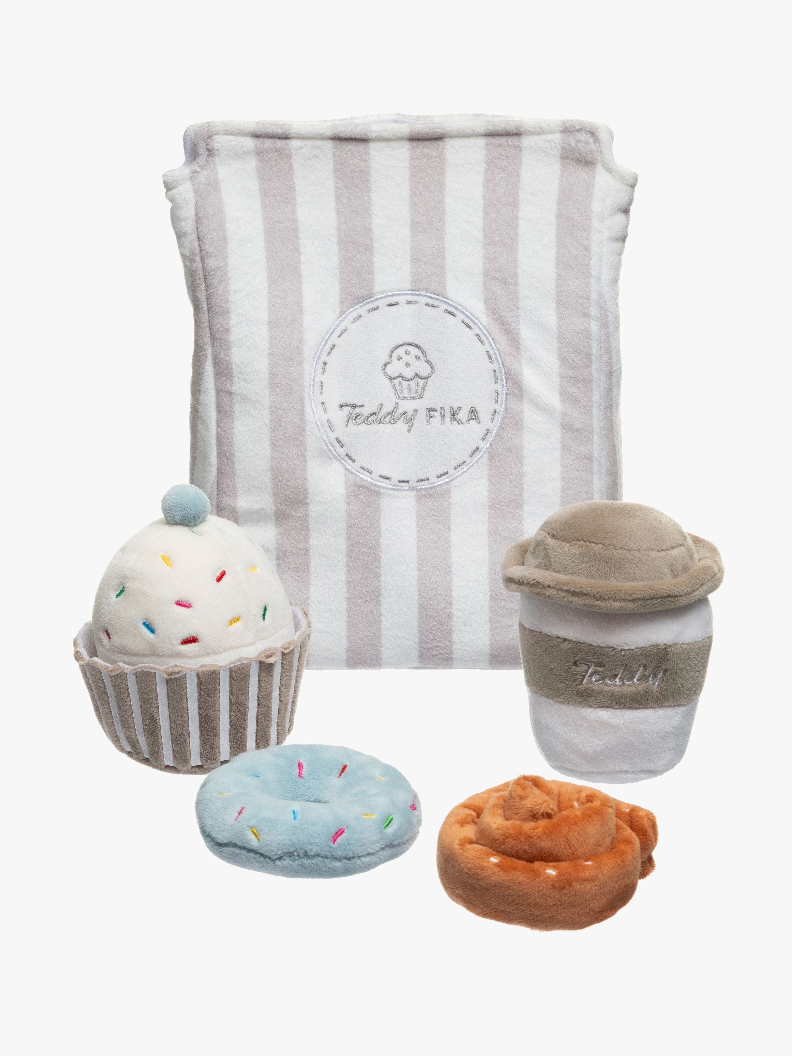 Blødt legesæt fra Teddykompaniet. Perfekt til timevis af fantasifuld leg. - Indeholder: 1 pose, 1 kaffekop, 1 kanelsnegl, 1 cupcake, 1 donut. - CE-mærket. - Anbefalet alder: Fra 12 måneder.