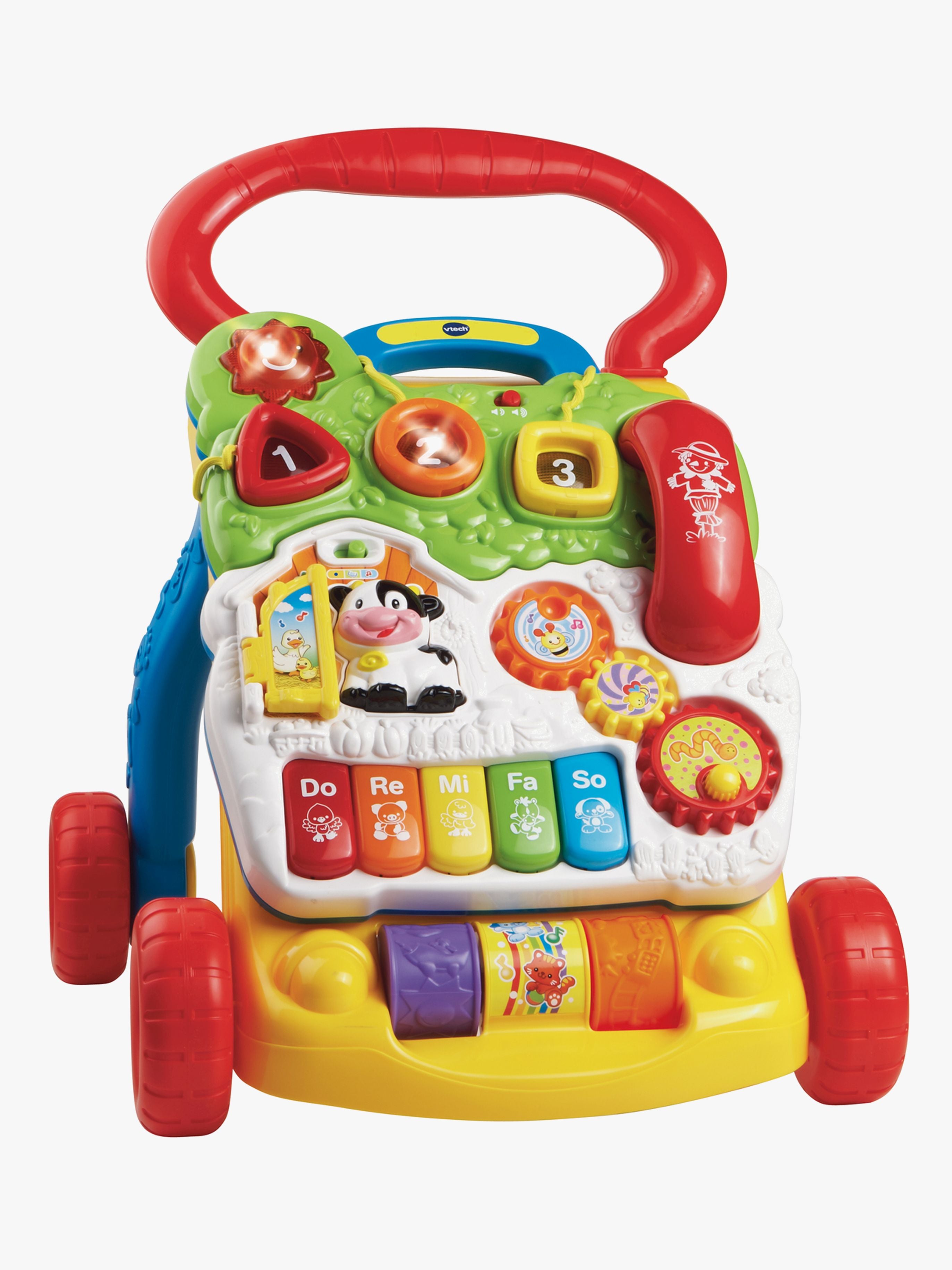 Sjov og udviklende lære-at-gå-vogn fra Vtech med fire hjul. Vognen har aktivitetslegetøj, der udvikler dit barns sanser og motorik. Den har blandt andet 30 forskellige sange og lyde man kan lytte til, en sol man kan trykke på, tal der kan undersøges og tandhjul der kan drejes på. Aktivitetspladen kan tages af så man også kan lege med det alt sammen på gulvet. Med denne charmerende vogn bliver dit barn både bedre til at gå og har en masse nyt at udforske. Mål: 38,1 x 52,8 x 13 cm Anbefalet alder: Fra 6 måneder.
