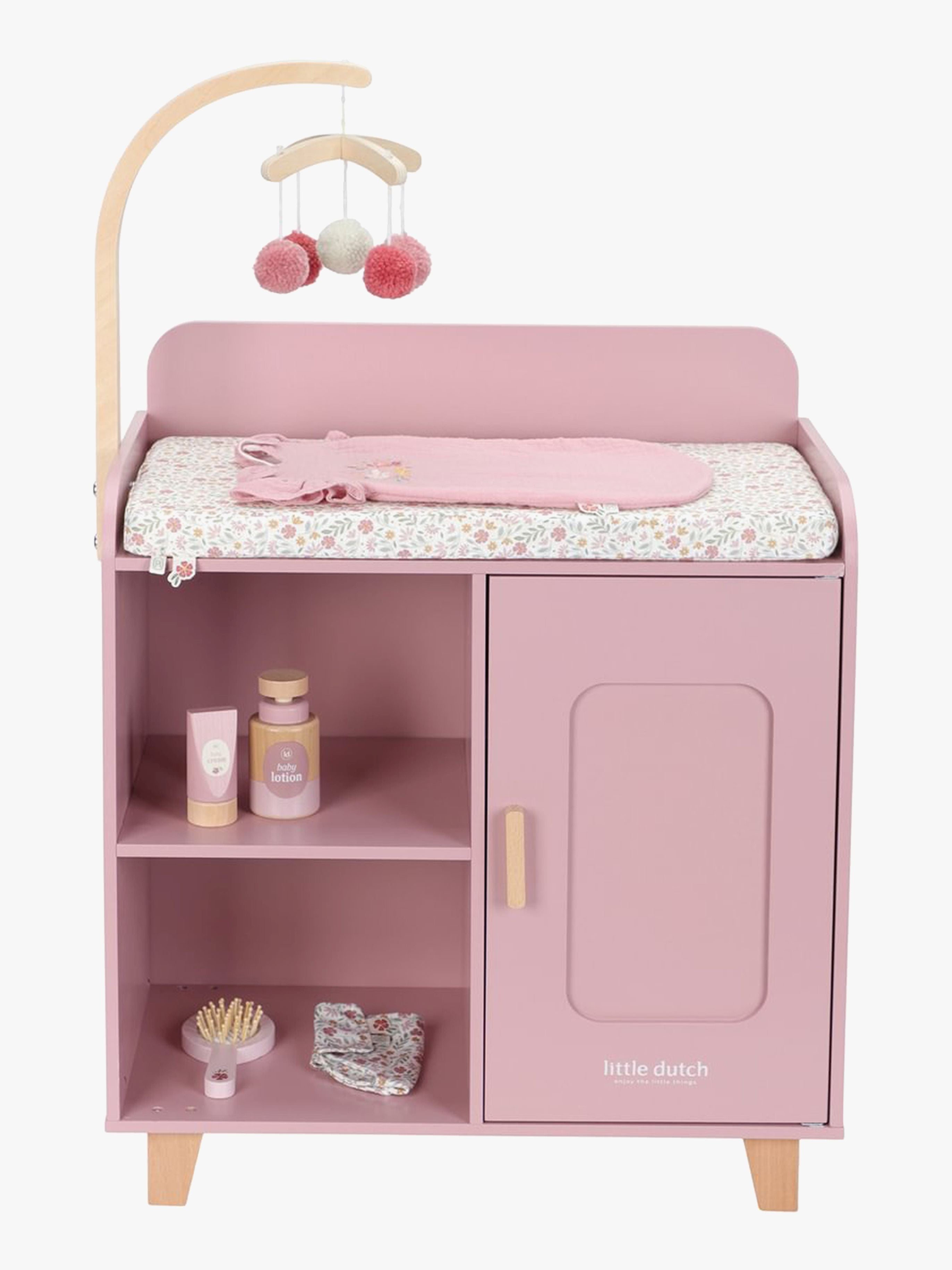 Puslebord fra Little Dutch med et blomstret design i flotte farver. Det har en uro med bløde bolde og en masse sjovt tilbehør til at pleje din dukke med. Perfekt til timevis af fantasifuld leg. - Indeholder: 1 puslebord, 1 puslepude, 1 sovepose, 1 stofble, 2 bøjler, 1 dukkehårbørste, 2 bodylotioner. - Leveres med flot mobil. - Opbevaringsplads indeni. - Farverigt design. - Perfekt til fantasifuld leg med din dukke. - Dukke medfølger ikke. - CE-mærket. - Anbefalet alder: Fra 3 år. - Træ.