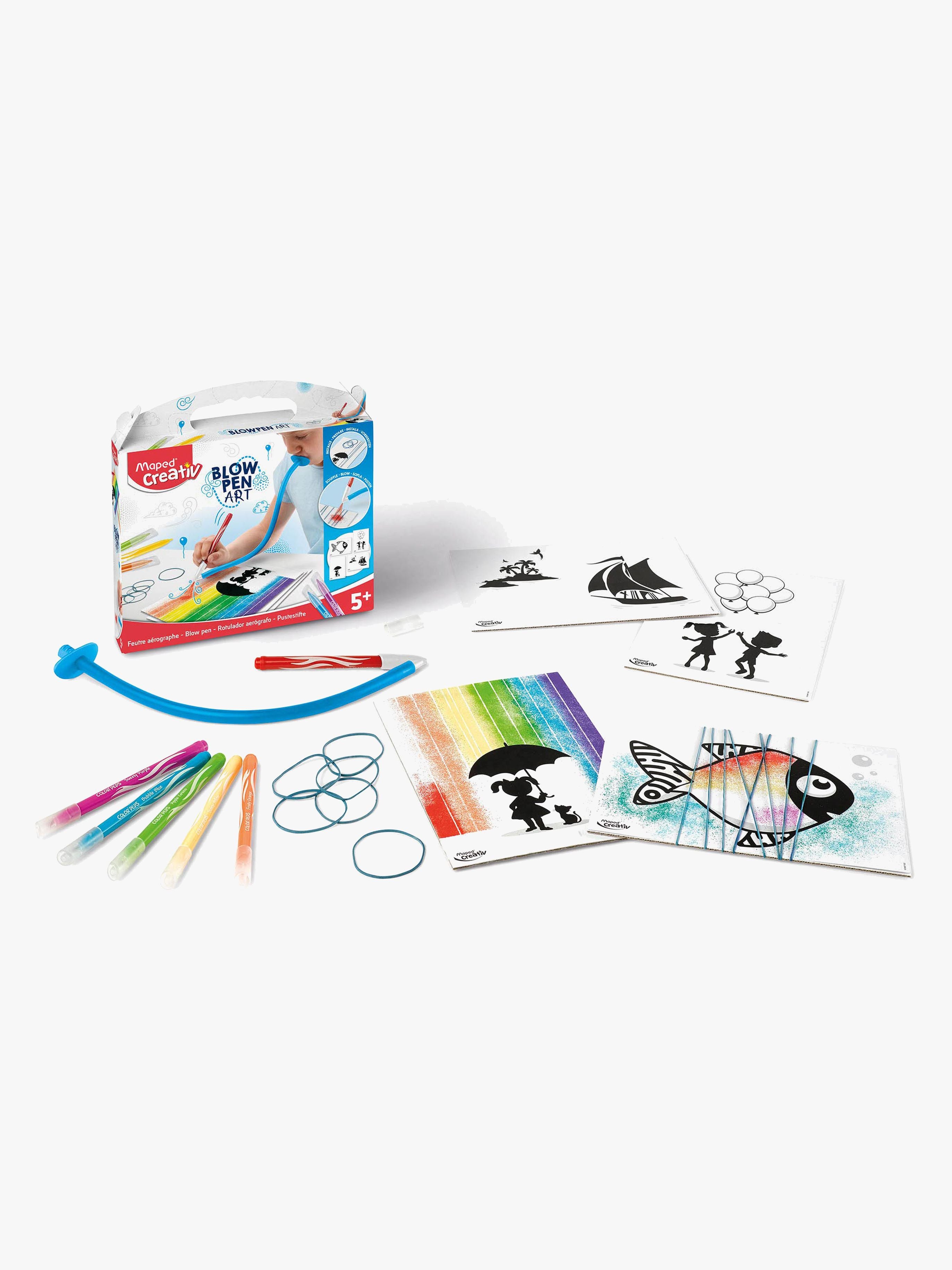 Sprøjtepenne fra Maped i seks farver med seks skabeloner med forskellige motiver. Denne kasse indeholder alt det du skal bruge til at skabe billeder med airbrush-teknik. Du sprøjter farven ud med den medfølgende slange. Farverne er giftfrie og vandopløselige. CE-mærket.