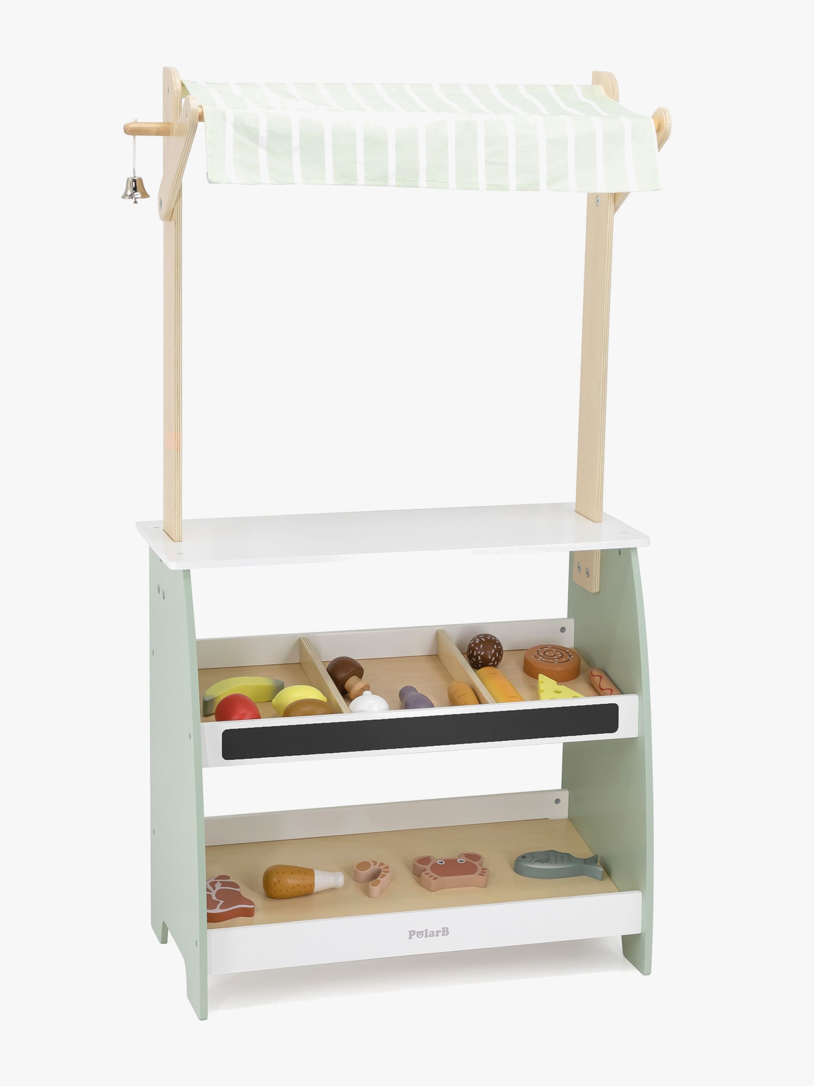 Markedsbod fra PolarB med et inspirerende design. Den har 23 forskellige madvarer i forskellige former og farver såsom frugt, grøntsager, kød og skaldyr og en ringeklokke så du nemt kan fange kundernes opmærksomhed. Markedsboden har en lille kridttavle der kan bruges til fødevarenavne og priser. Perfekt til timevis af fantasifuld leg. - CE-mærket. - Anbefalet alder: Fra 3 år. - Træ.