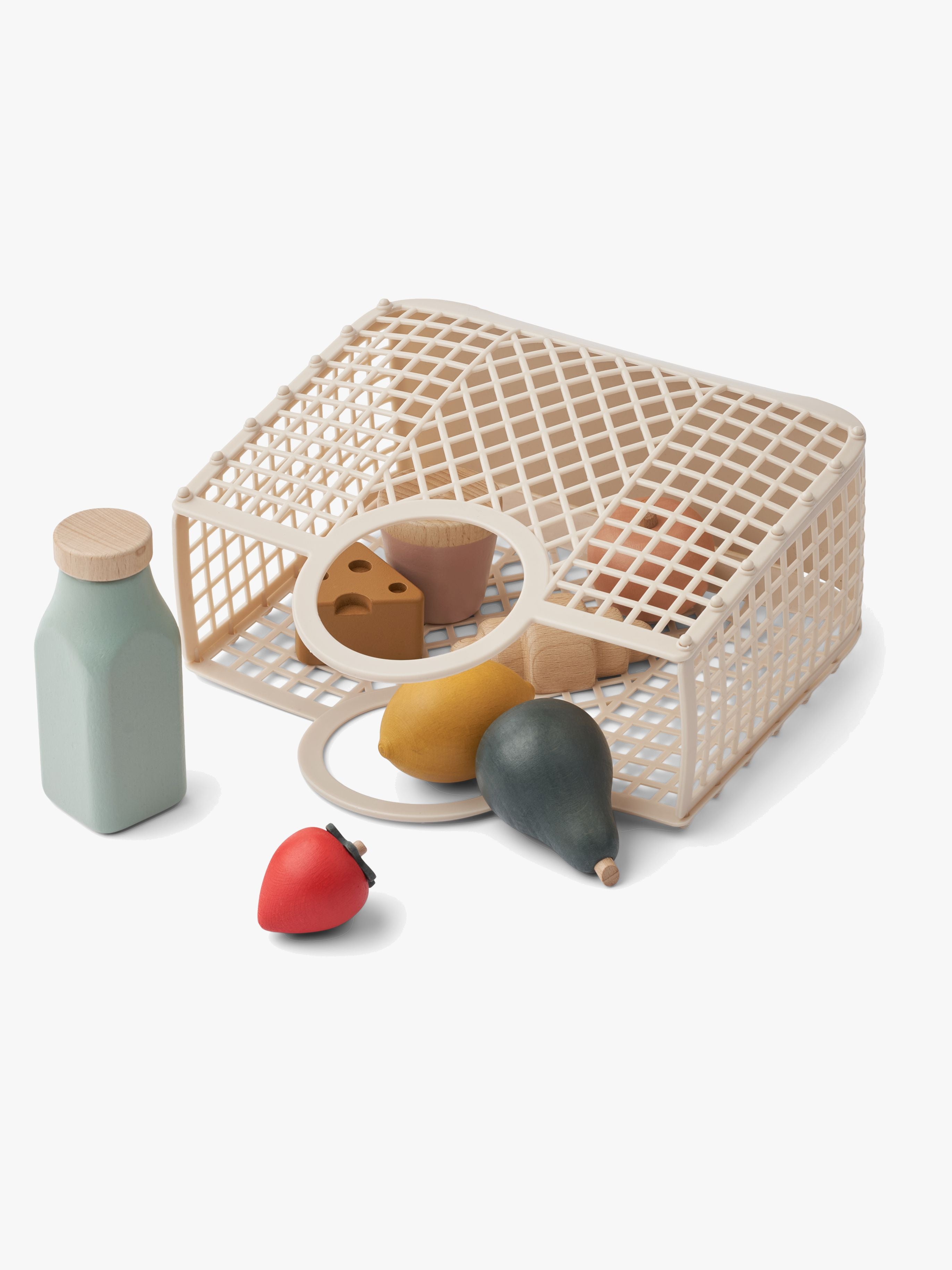 Indkøbspose fra LIEWOOD med søde fødevarer. Perfekt til kreativ rolleleg. - Indeholder 1 pose og 8 fødevarer. - Indeholder tomat, citron, jordbær, fersken, croissant, mælk, ost og is eller yoghurt. - Til sjov og fantasifuld rolleleg. - Mål: H 23 x B 23 x D 8,5 cm. - CE-mærket. - Anbefalet alder: Fra 5 år. - Pose: 60 % genanvendt polyethylen, 40 % polyethylen. - Fødevarer: 100 % bøgetræ.
