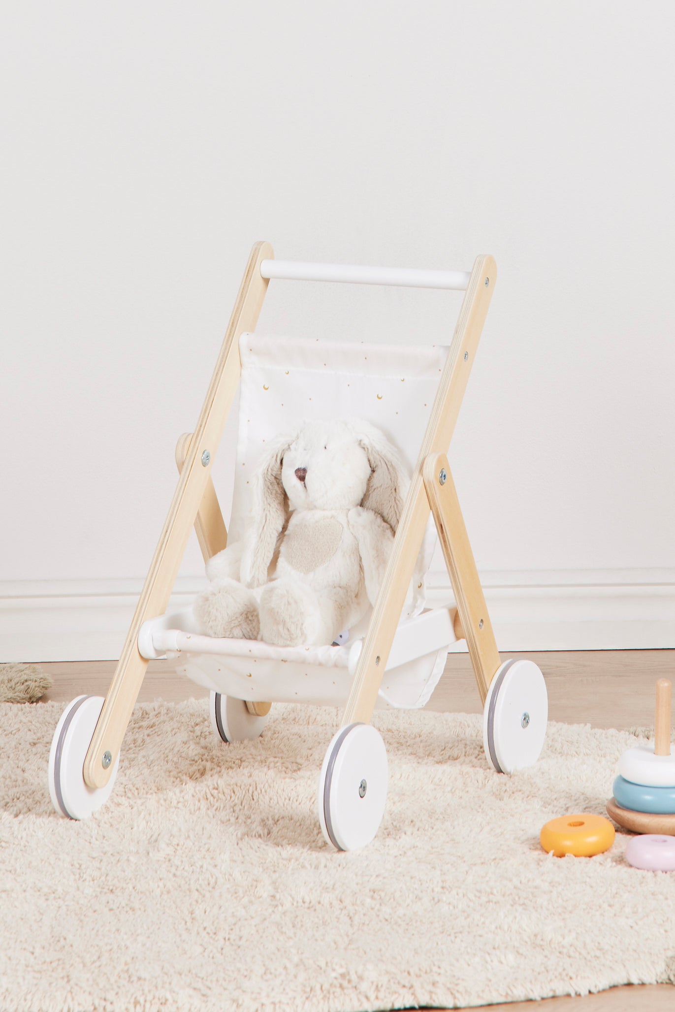 Dukkevogn i trę fra PolarB med et stilfuldt design. Perfekt til mange timers sjov. - Barnevogn til dukker og bamser. - Perfekt til rolleleg. - Passer til dukker op til 38 cm. - Opmuntrer til både social og individuel leg. - Blųde, stųjsvage gummihjul der ikke ridser gulvet. - CE-męrket. - Anbefalet alder: Fra 3 år. - Trę, stof.