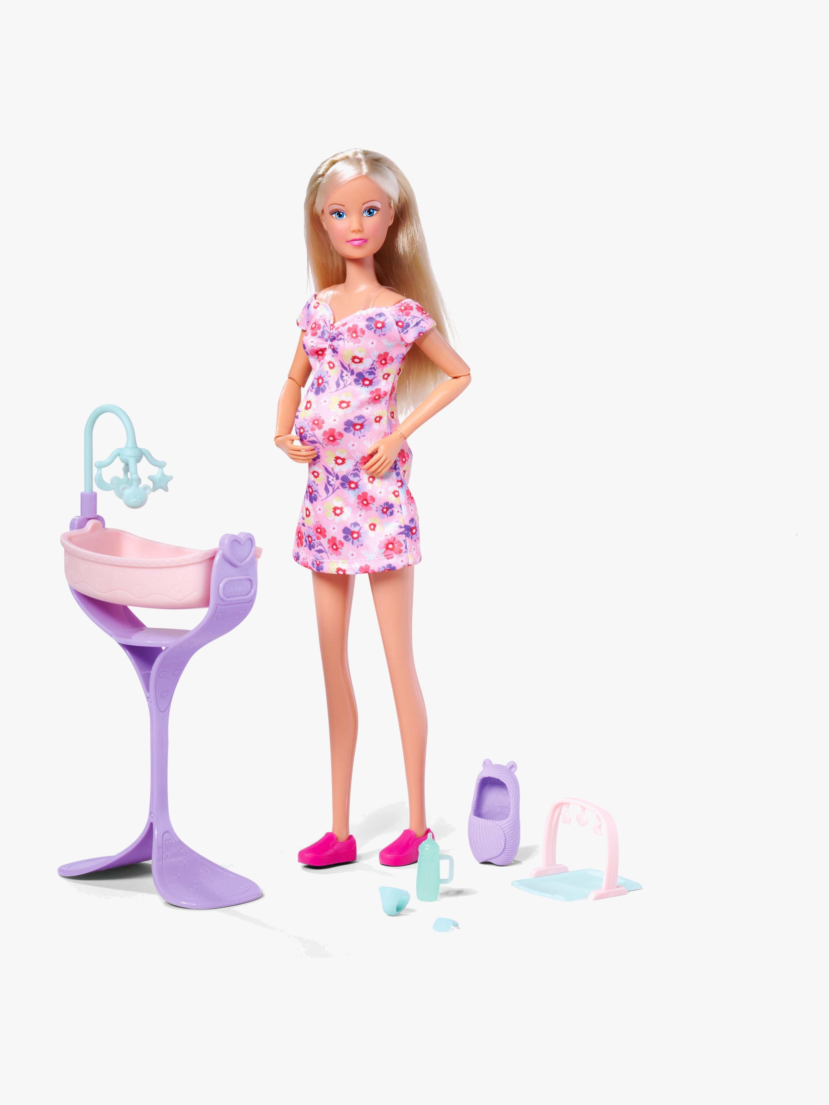 Gravid dukke fra Steffi Love med en voksende mave og andet tilbehør. Perfekt til mange timers sjov. - Dukkesæt med Steffi, den glade og forventningsfulde mor. - Gravid mave, der vokser hver dag. - Flere forskellige tilbehør medfølger, fx en hyggelig krybbe og en legemåtte. - Babyen medfølger også. - CE-mærket. - Anbefalet alder: Fra 3 år. - Plastik.