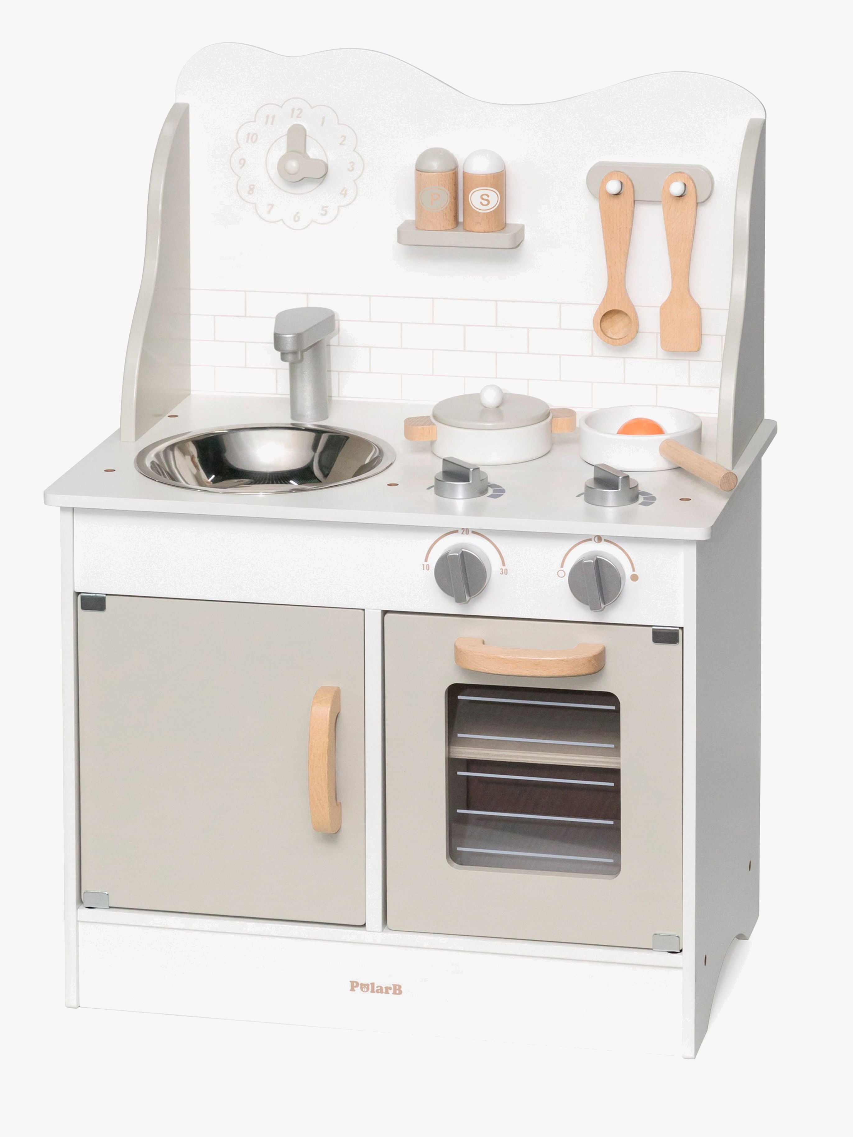 Fint legekøkken fra PolarB med masser af spændende køkkenredskaber. Perfekt til timevis af fantasifuld leg. - Indeholder: 1 legekøkken, 1 stegepande, 1 spejlæg, 1 salatskål, 1 peberkværn, 1 gryde, 1 paletkniv, 1 grydeske. - Håndvask. - Komfur. - Ur. - Ovn, der kan åbnes. - CE-mærket. - Ikke egnet til børn under tre år på grund af små dele. - Anbefalet alder: Fra 3 år. - MDF, krydsfiner, træ.