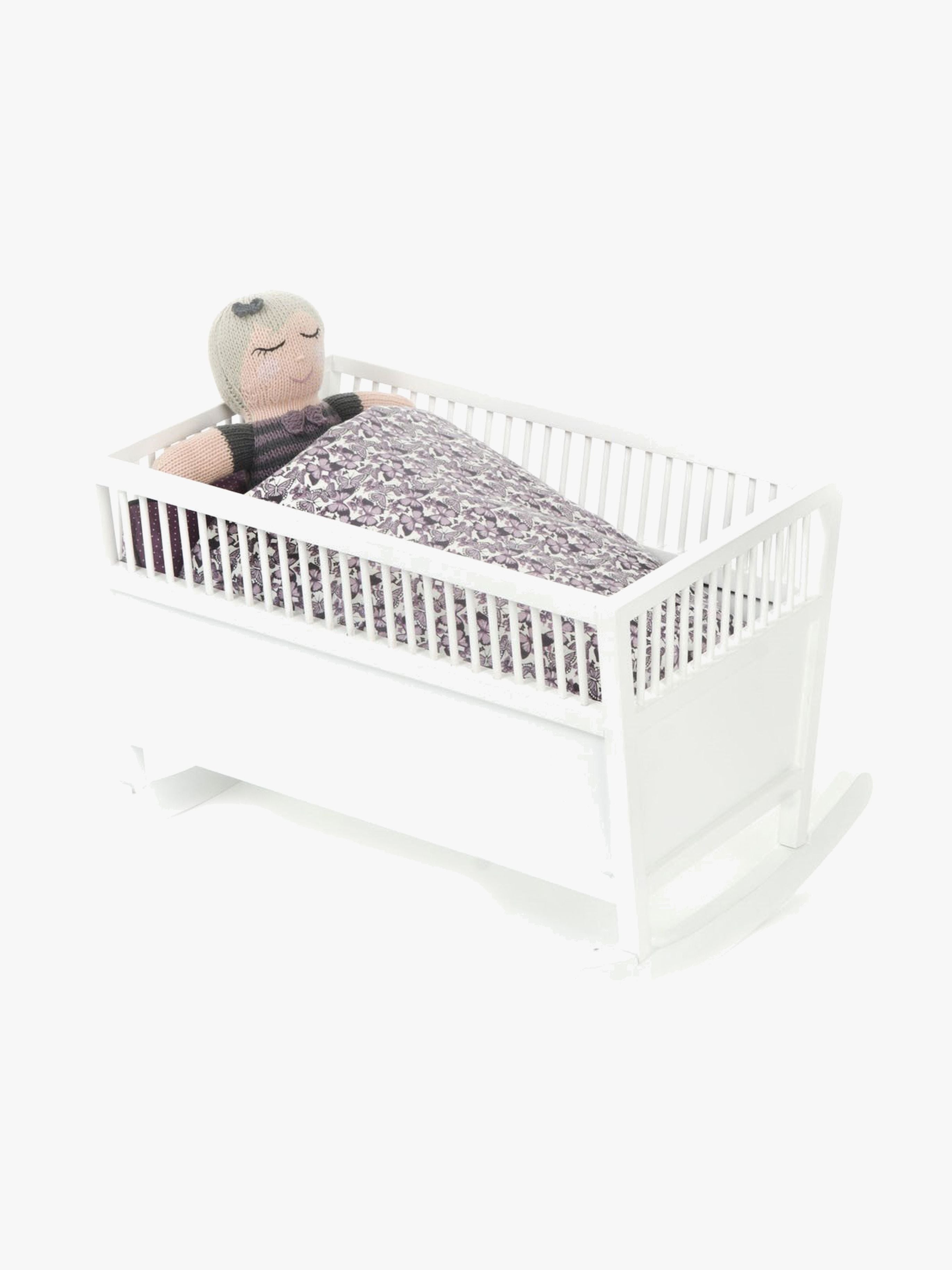 Denne herlige vugge fra Smallstuff passer perfekt til dit barns dukker eller bamser! Vuggen er i et stilrent og klassisk design med flotte sider og en bund, der gør at man kan vugge dukken i søvn. Med til sengen hører også en madras således dukken ligger godt. Mål: H29 x B28,5 cm. Materiale: Træ. Farve: Hvid. OBS! Dukke og tæppe indgår ikke.
