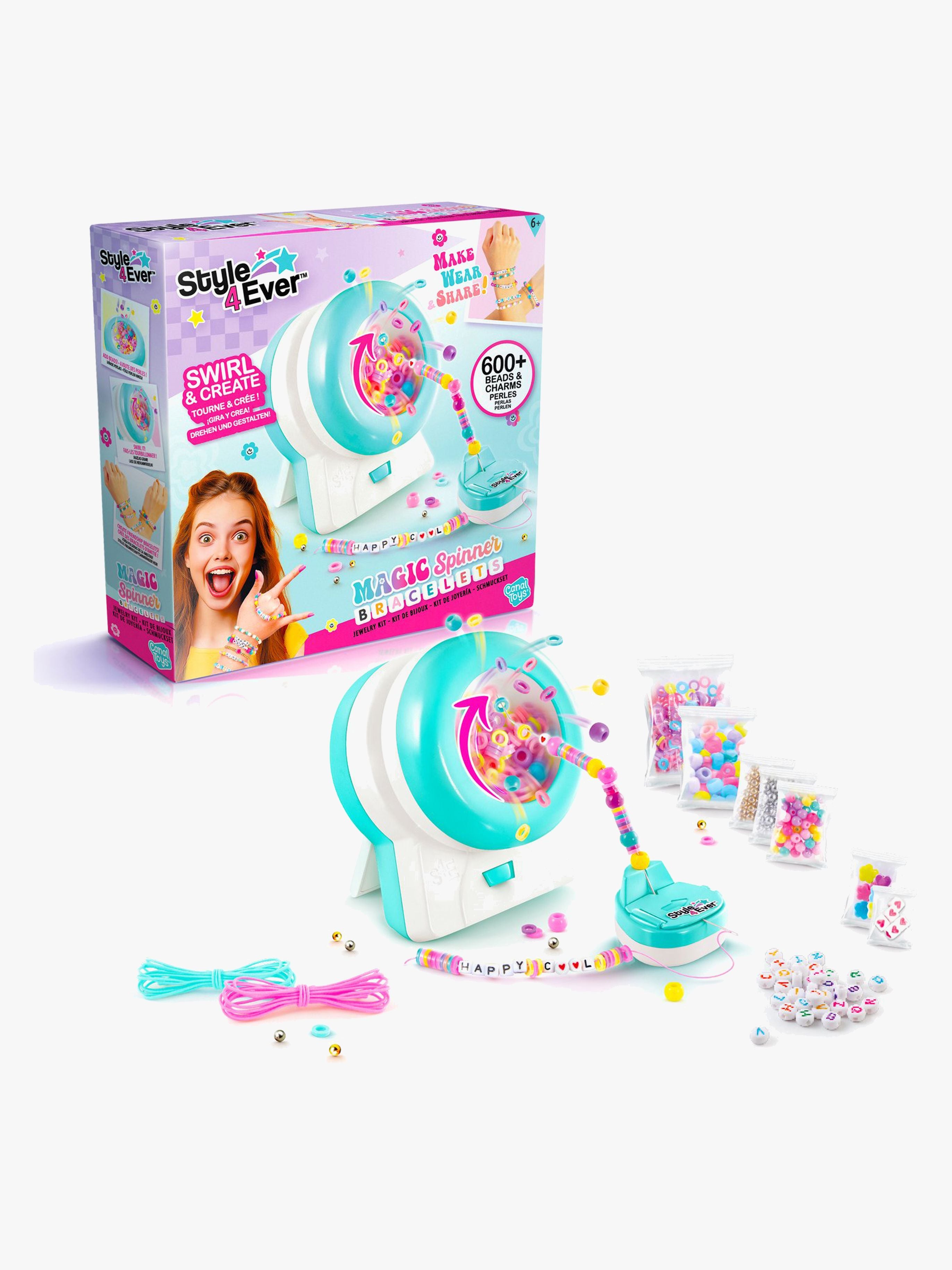 Armbåndssæt fra Style 4 Ever med magiske egenskaber. Spinneren fastgør perler til din smykkesnor i en tilfældig rækkefølge. Lav dine armbånd, brug dem og del med dine venner. Perfekt til kreative stunder. - Mere end 600 forskellige perler. - Oplader medfølger. - Stimulerer dit barns kreativitet. - CE-mærket. - Anbefalet alder: Fra 6 år. - Plastik.