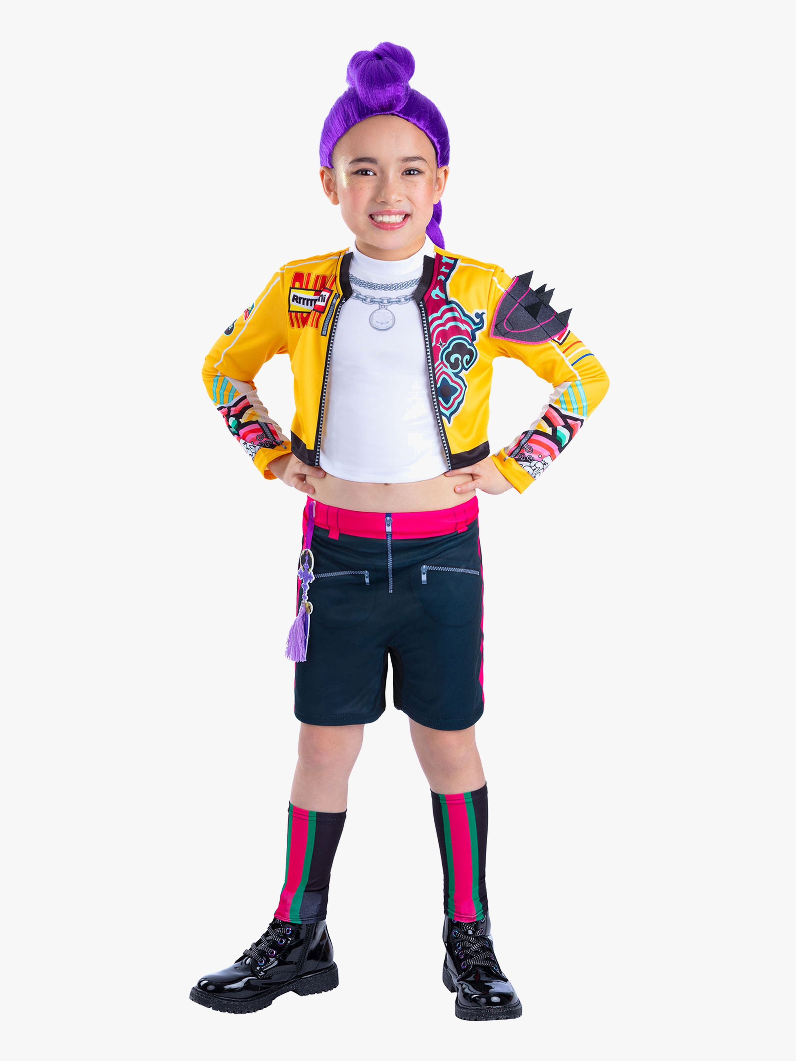 Kostume fra Rubies til at klæde sig ud som Rumi fra den populære film. Det har en top med en sej, syet jakke og sorte shorts med elastisk talje. Kostumet har traditionelle, Koreanske smykker for at fuldende outfittet. Perfekt til udklædning og rolleleg. - Tryl dig selv til din yndlingsfigur. - Elastisk talje. - Velcrolukning. - Fine trykte detaljer. - Perfekt til alle K-Pop Demon Hunters-fans. - Til sjov og fantasifuld rolleleg. - CE-mærket. Indeholder: top med en syet jakke, shorts, smykker. - Anbefalet alder: Fra 6 år. - 100 % polyester.