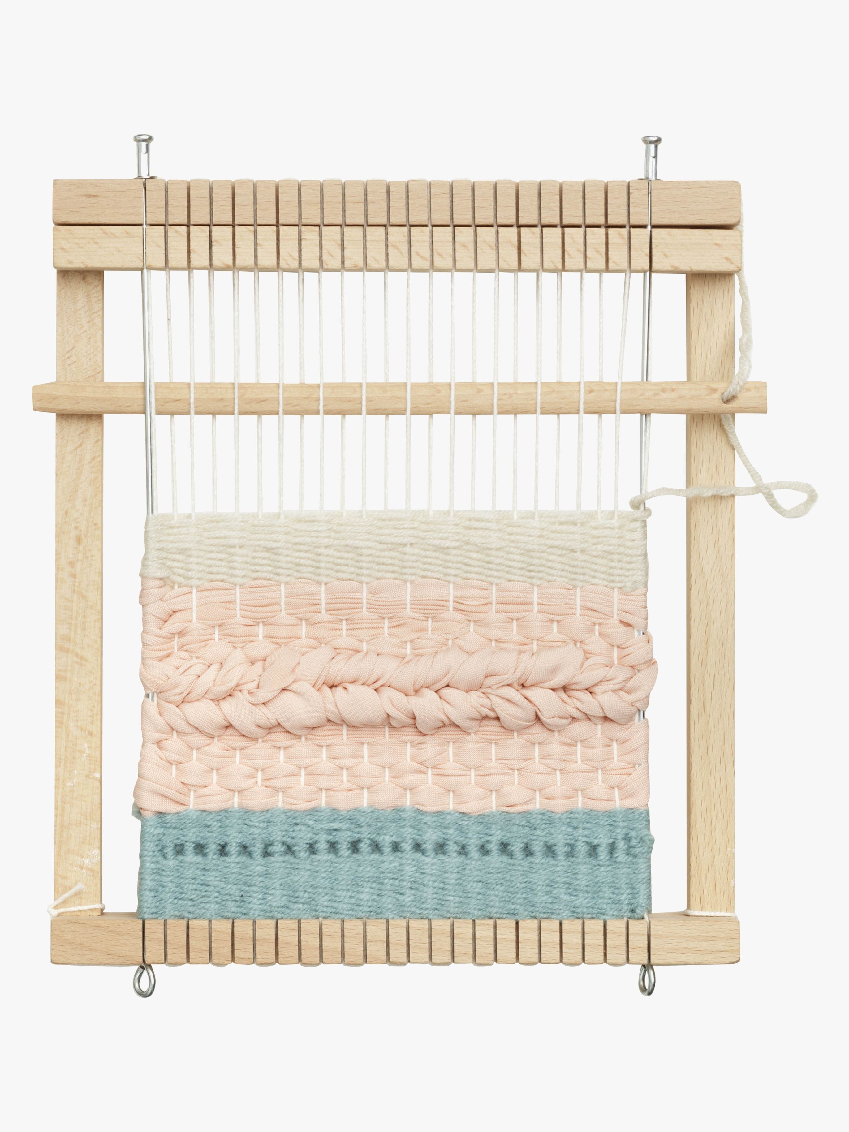 Klassisk væveramme fra Micki med garn i 3 farver. Med væverammen kan du skabe søde duge eller flotte tæpper til dukkehuset. Rammen er trådet og klar i til brug, så du kan begynde at væve med det samme.