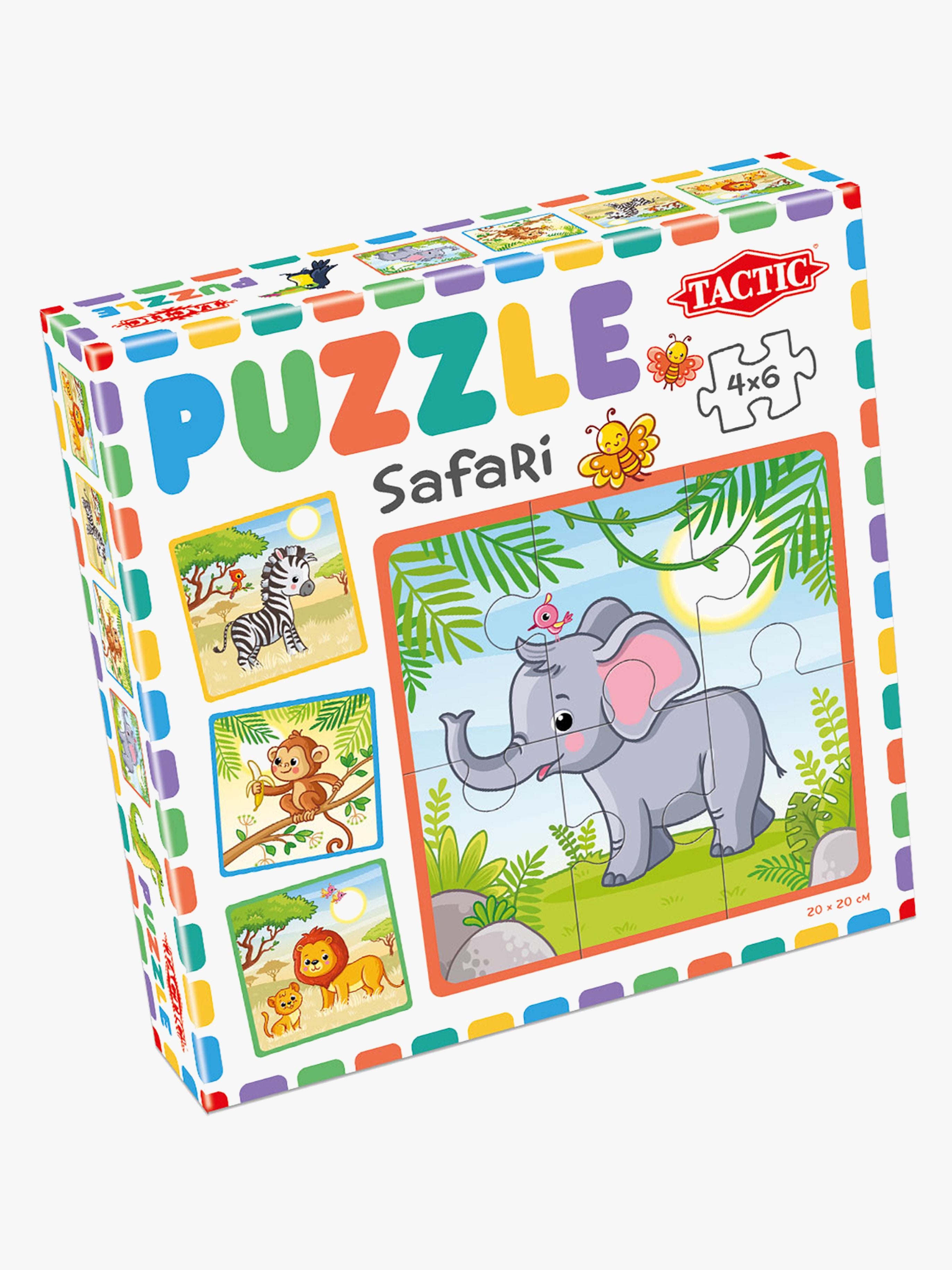 Puslespillet, Mit Første Puslespil fra Tactic, passer perfekt til de lidt yngre børn. Sættet indeholder fire forskellige puslespil med safarimotiver. Hvert puslespil består af seks store brikker med farverige motiver. Anbefalet alder: Fra 3 år.