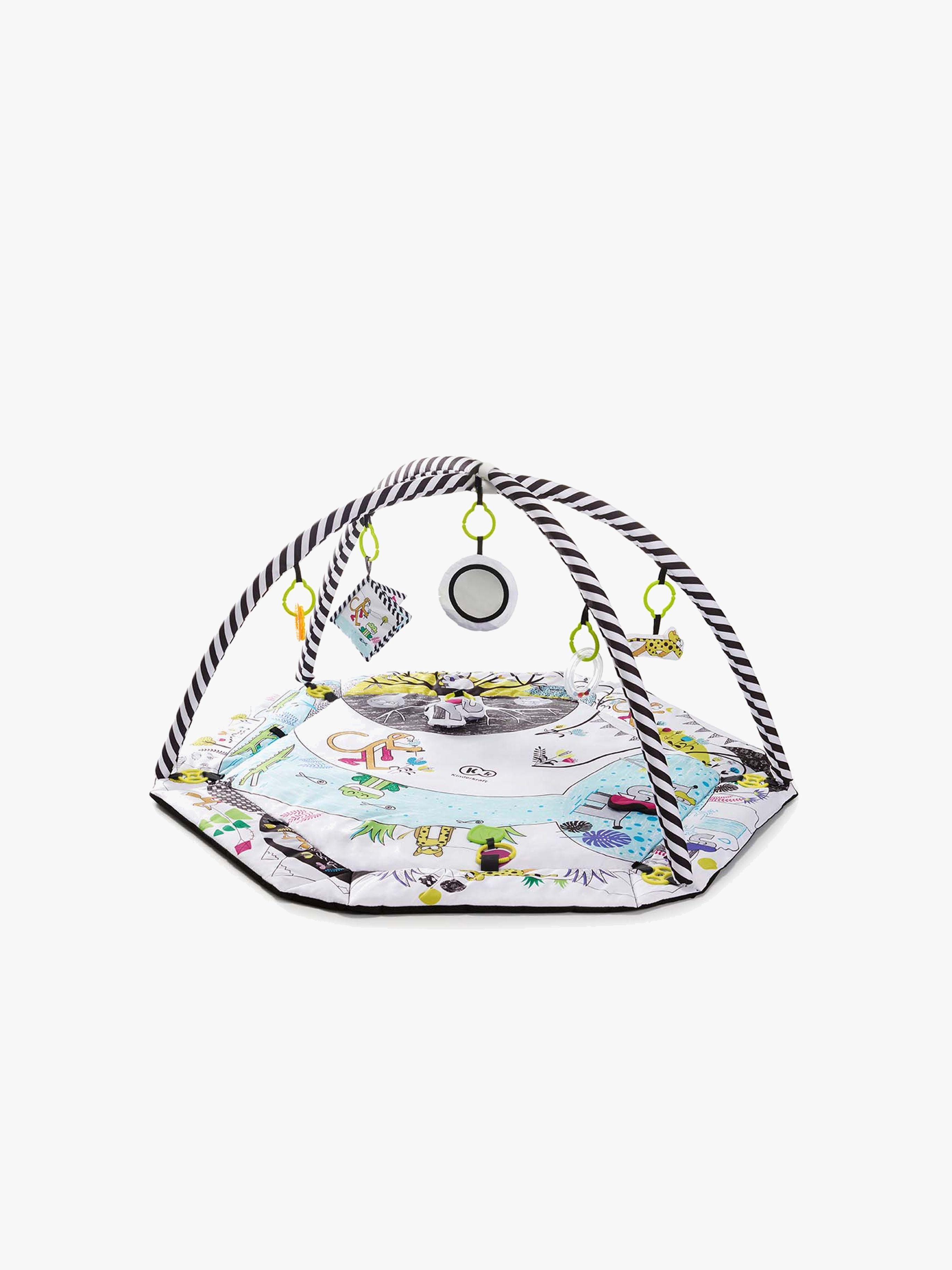 Et skųnt aktivitetstęppe fra Kinderkraft. Tęppet har dyremotiv og to justerbare legebųjler med fem forskellige stykker legetųj, som både underholder og stimulerer dit barn. Legetųjet kan tages af og sęttes fast i tęppet, så dit barn kan udforske det, som det vil. Med blandt andet et spejl og to stykker tyggelegetųj, kommer dit barn ikke til at kede sig. Der medfųlger desuden en pude, så dit barn kan ligge dejligt på maven. Aktivitetstęppet kan desuden bruges som boldhav. Sęt vęggene op og slip 20 bolde i forskellige farver lųs. Så kan legen begynde! Aktivitetstęppet er nemt at transportere og opbevare. Tęppet kan desuden vaskes. Både du og dit barn vil elske dette aktivitetstęppe!