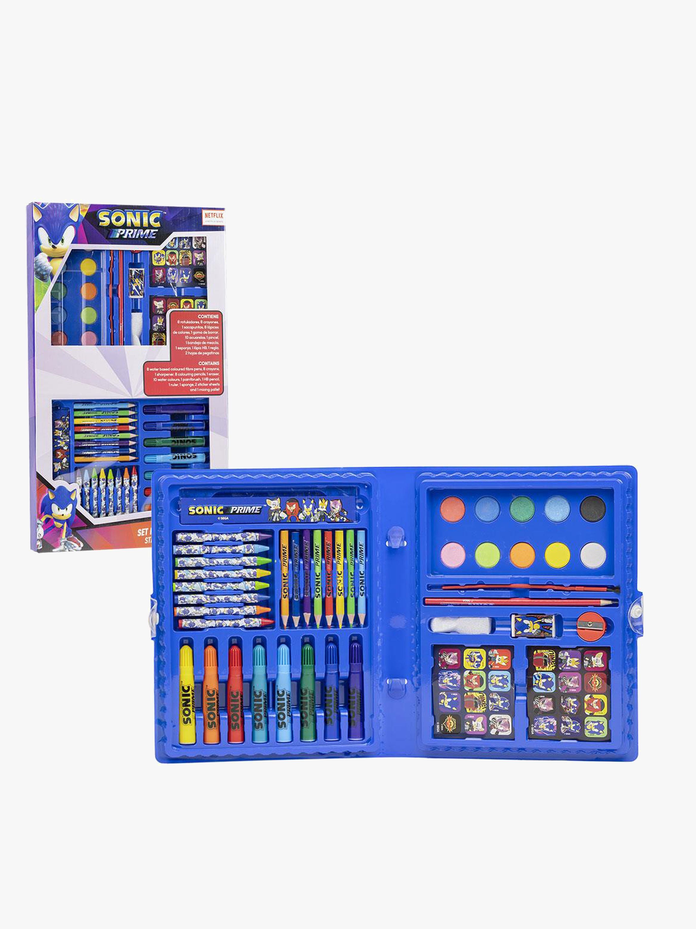 Malesæt fra Sonic med en masse spændende maletilbehør med et sejt tema. Perfekt til kreative aktiviteter. - Indeholder: 8 filttusser, 8 farvekridt, 8 farveblyanter, 2 blyanter, 1 viskelæder, 1 blyantspidser, 1 lineal, 2 klistermærkeark, 12 vandfarver, 1 pensel. - Let at opbevare. - Flot design. - Perfekt at tage med på udflugter og ture til dit barn. - CE-mærket. - Anbefalet alder: Fra 2 år. - Plastik.