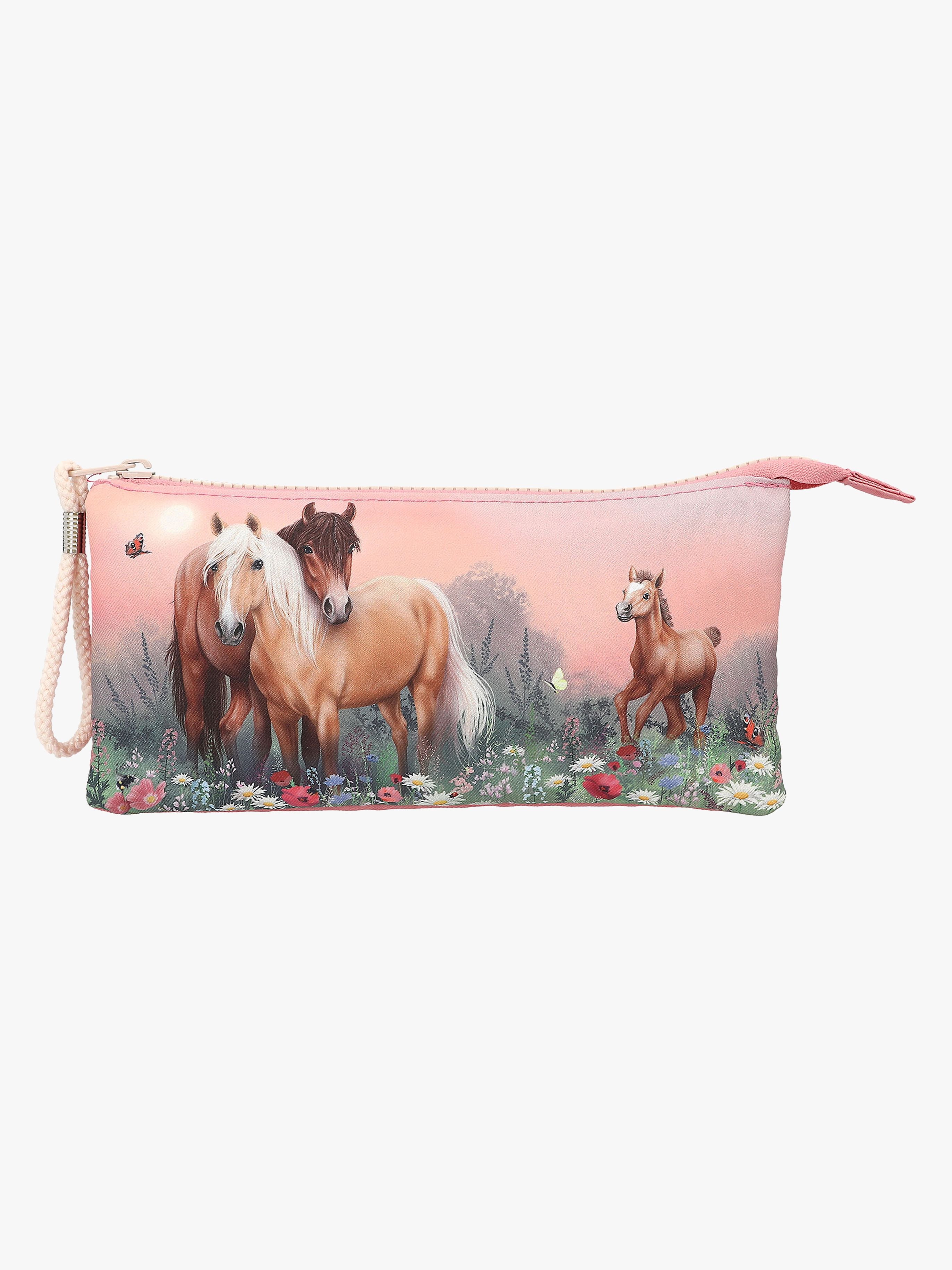 Fint penalhus fra Miss Melody med tre store rum. Perfekt til kreative aktiviteter. - Hestemotiver. - Tre rum med to lynlåse. - Kan også bruges som makeup-taske. - Anbefalet alder: Fra 6 år.