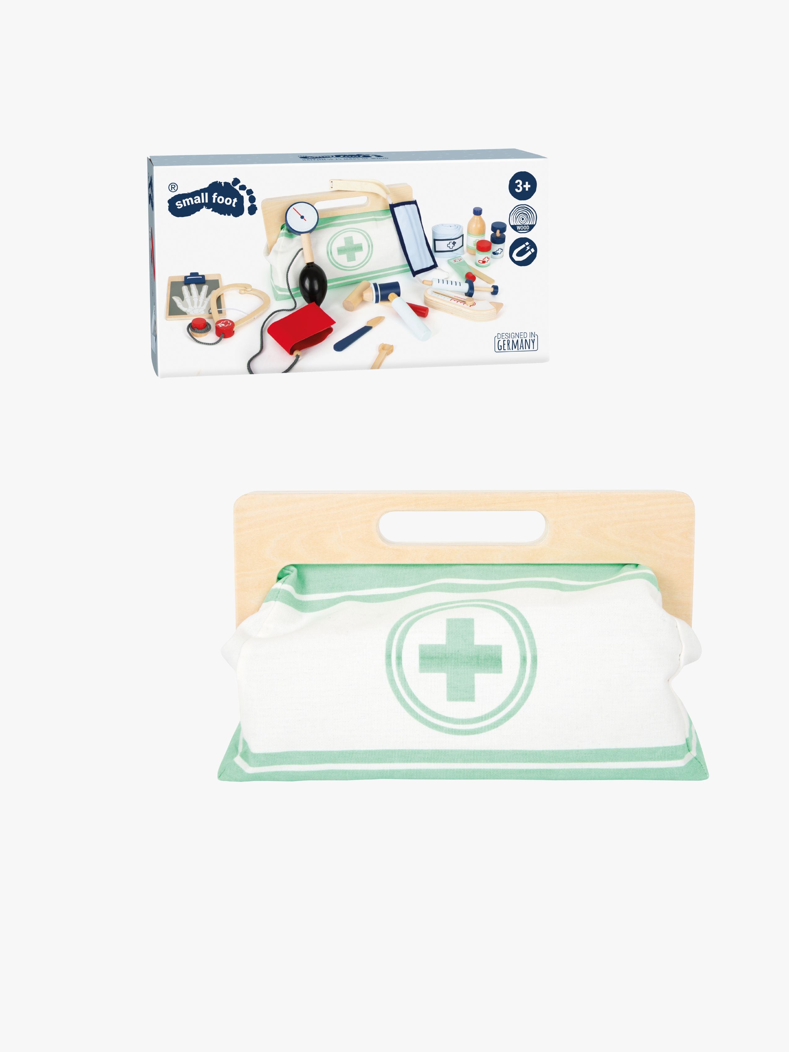 Doktortaske fra Small Foot med en masse spændende tilbehør at udforske. Den har alt som en lille doktor har brug for. Perfekt til timevis af fantasifuld leg. - Alle vigtige legetøjsredskaber, herunder stetoskoper, termometre, sprøjter, blodtryksmålere og otoskoper med forstørrelsesglas. - Indeholder alt, hvad du skal bruge for at lege doktor. - Let at tage med sig. - Kun fantasien sætter grænserne. - Inspirerer til rolleleg og kreativitet, og udvikler motorik og fantasi. - CE-mærket. - Anbefalet alder: Fra 3 år. - Træ.