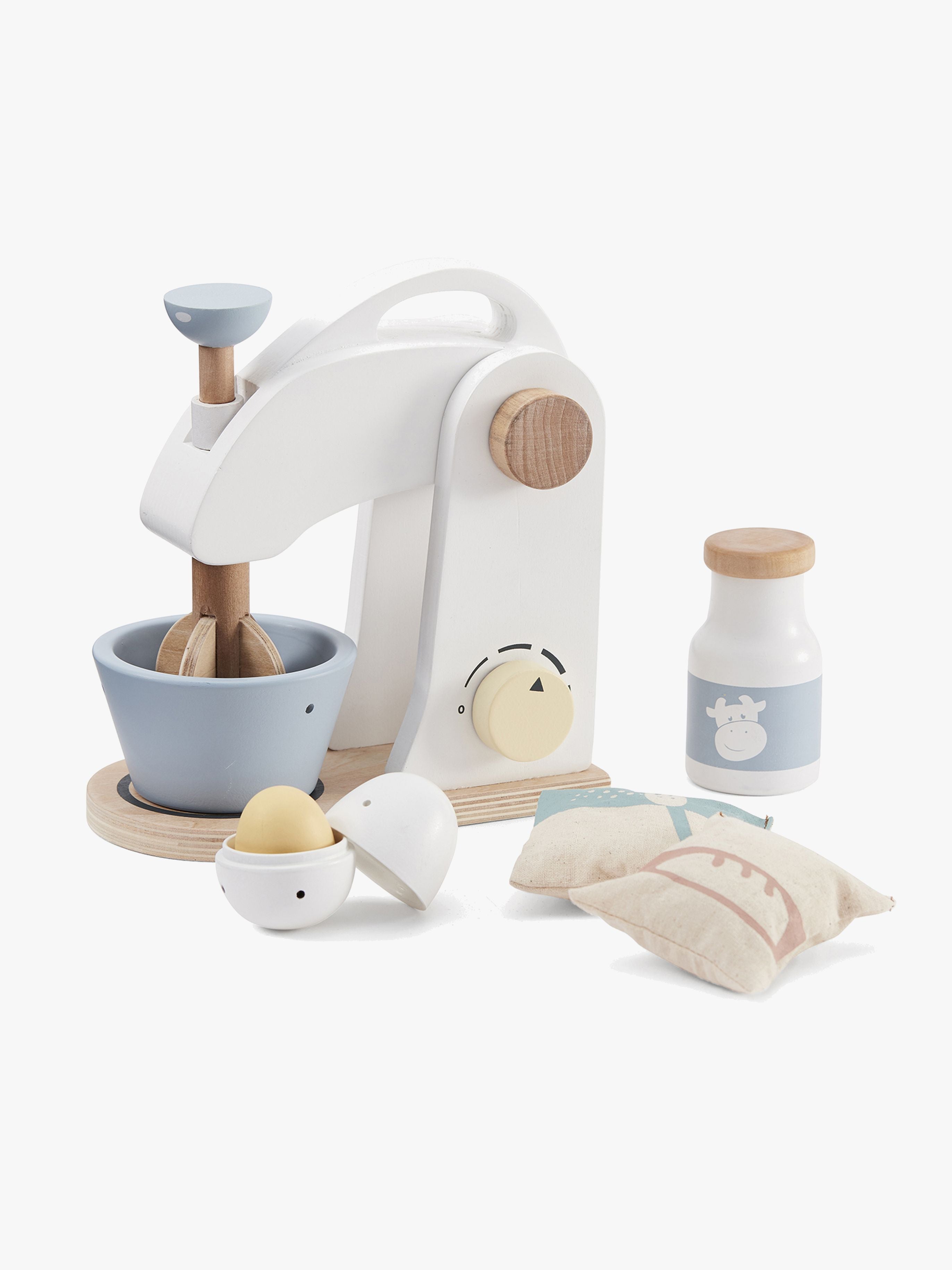 En lækker køkkenmaskine til dit barns legekøkken, komplet med mixer-skål og tilbehør man kan bruge til fantasi-madlavningen. Køkkenmaskinen og de øvrige produkter i pakken er fremstillet af kvalitetstræ. Pakken indeholder: - Mixer - Æg - Tre pakker sukker - Mælk - Mel Anbefalet alder: Fra 3 år.