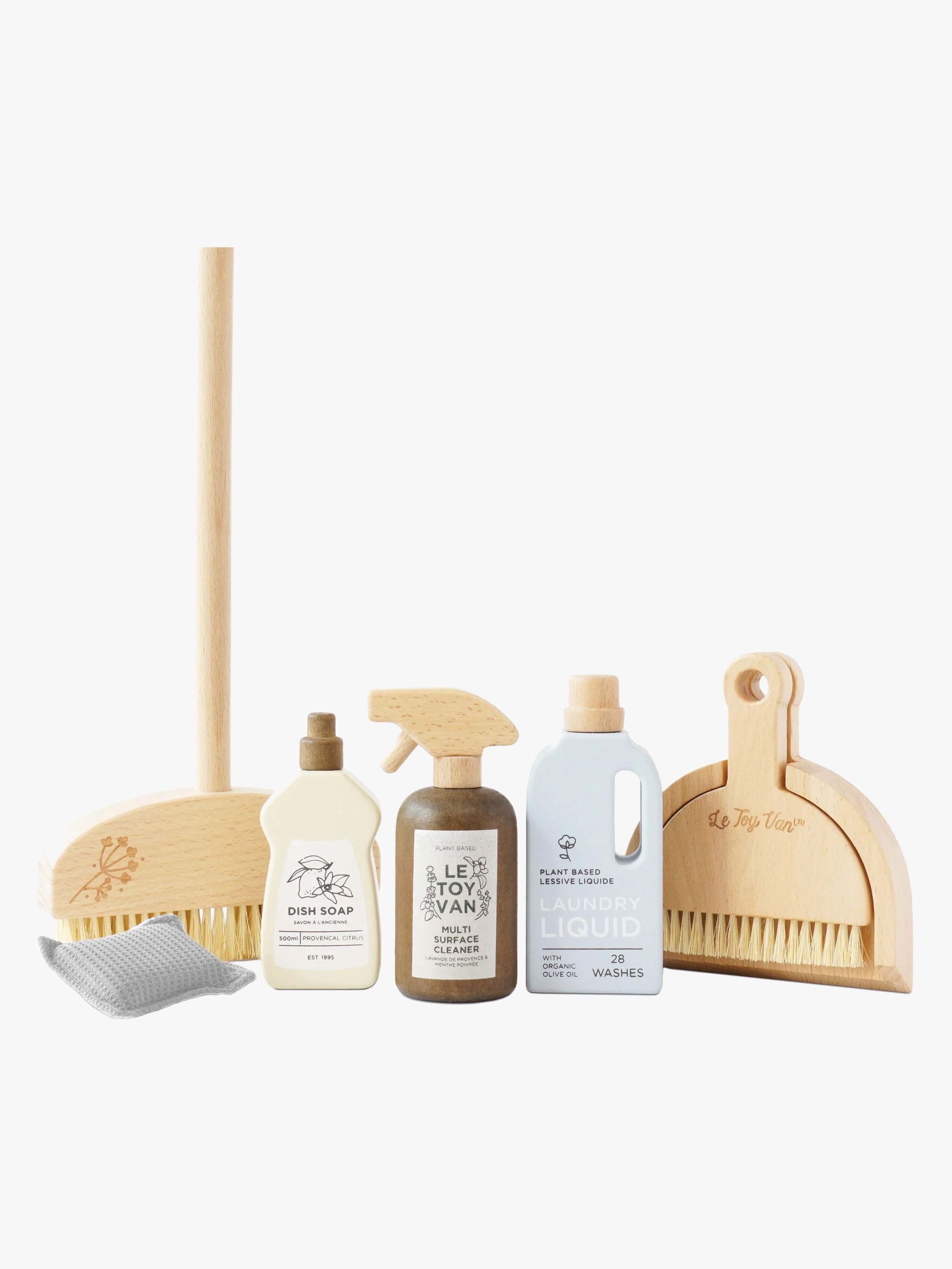Rengøringssæt fra Le Toy Van med en masse sjovt tilbehør. Det har et stilfuldt design. Perfekt til timevis af fantasifuld leg. - Indeholder: 1 børste, 1 fejekost, 1 svamp, 1 fejebakke, 3 tilbehør. - Perfekt til både leg og indlæring! - Genial til træning af hånd-øje-koordination og finmotorik. - CE-mærket. - Anbefalet alder: Fra 3 år. - Bøgetræ, tetræ, plastik, bomuld.